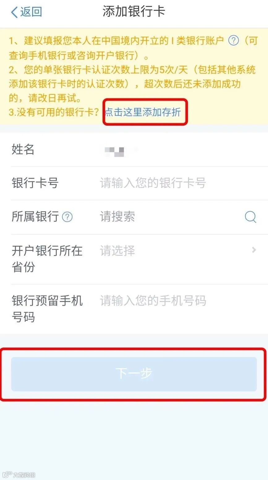 为快速办理退税,请提前添加用于接收退税的银行账户信息。建议填报本人在中国境内开立的一类银行账户,并确保在收到退税前处于正常状态。如果没有可用的银行卡,可以点击【点击这里添加存折】,添加存折信息。