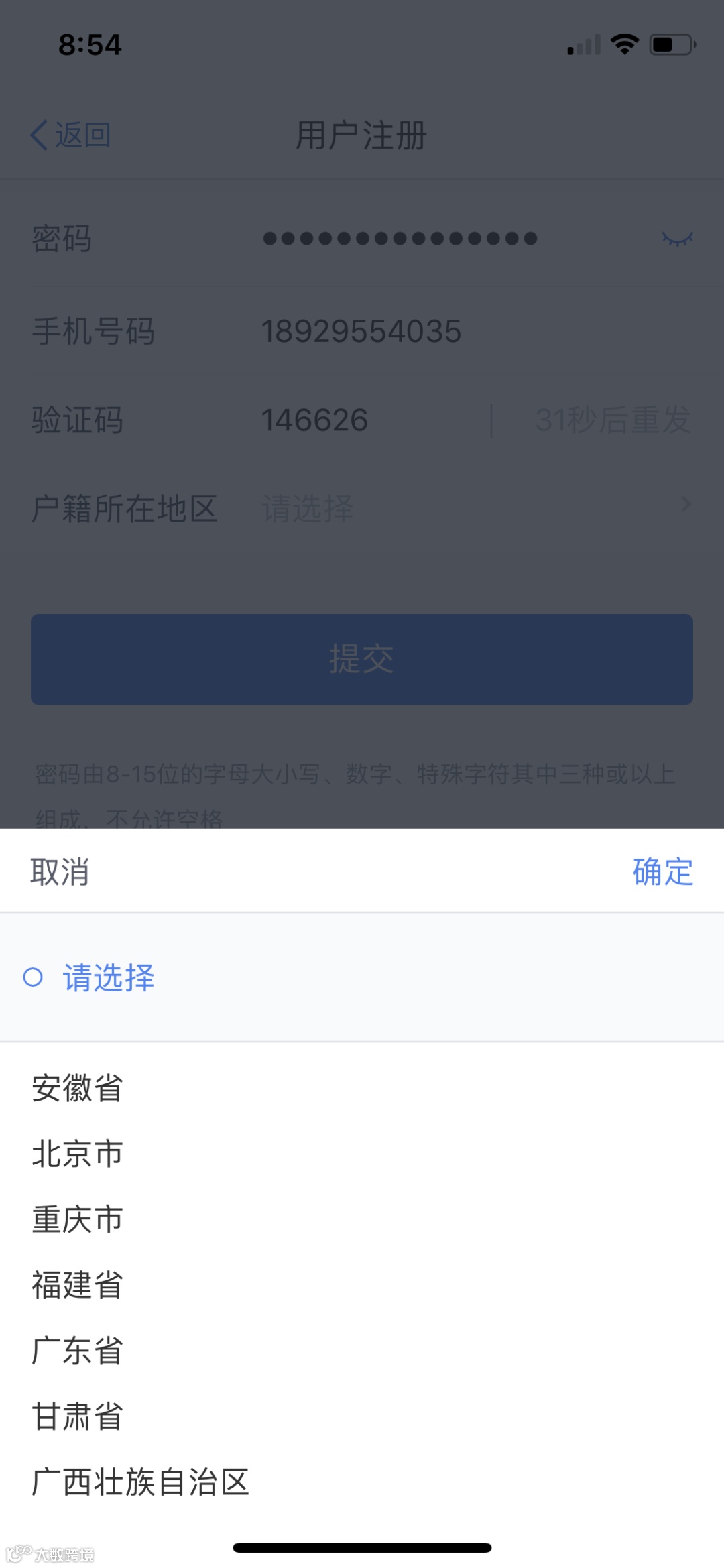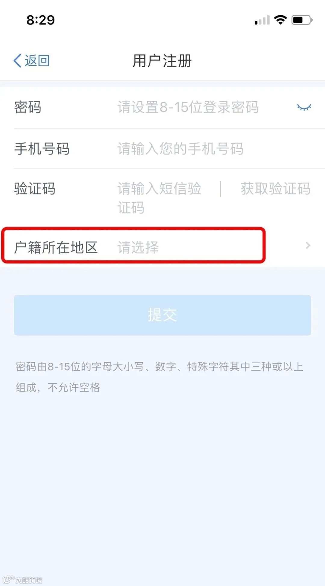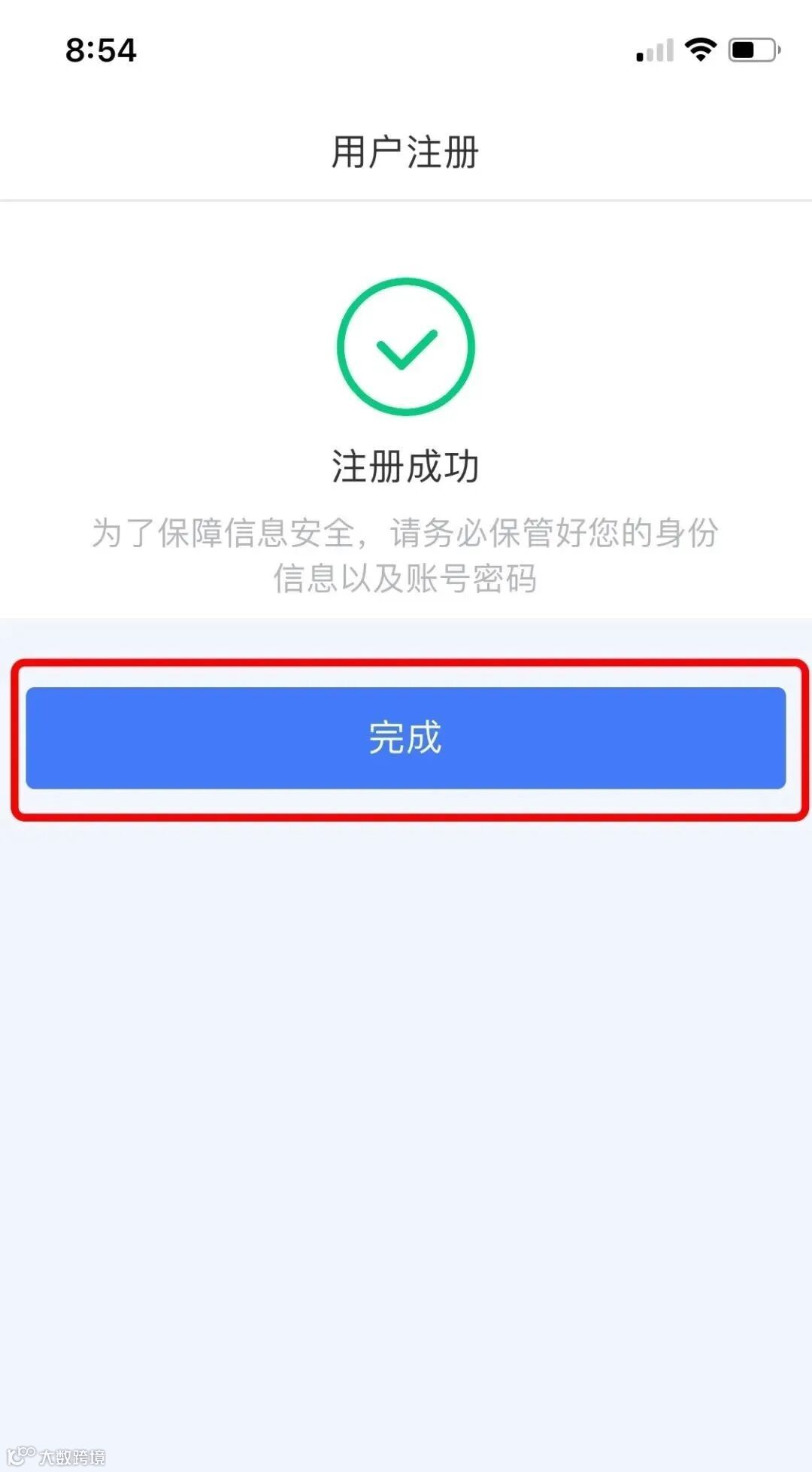 2.4垂直握紧手机进行拍摄,系统调用公安接口认证,通过后进入【用户注册】页面,设置密码、输入手机号、获取验证码,选择户籍所在地区,点击【提交】,系统提示注册成功,点击【完成】,即完成注册
