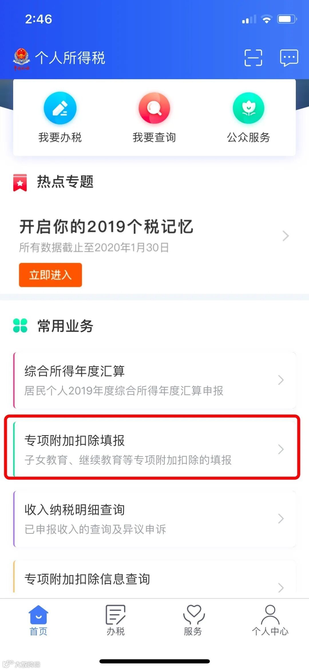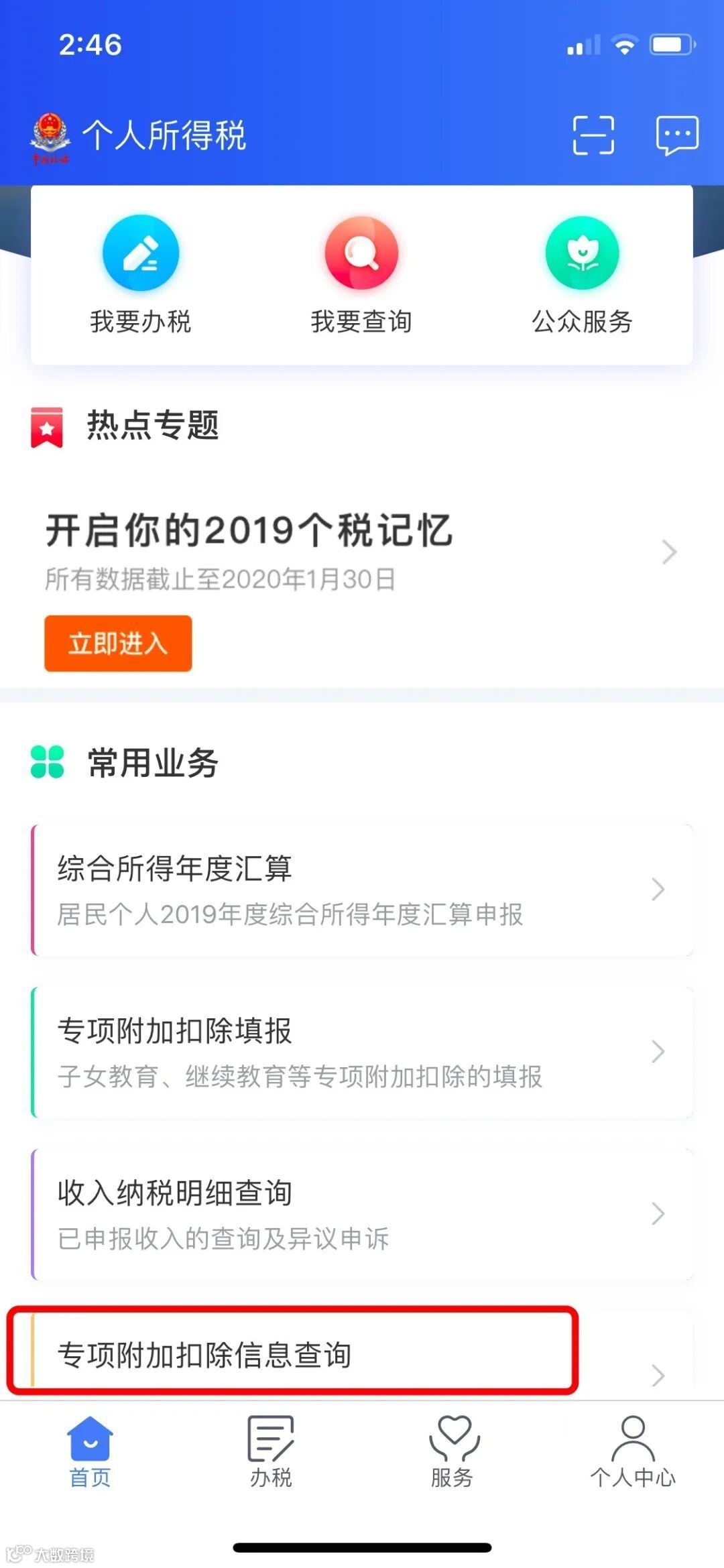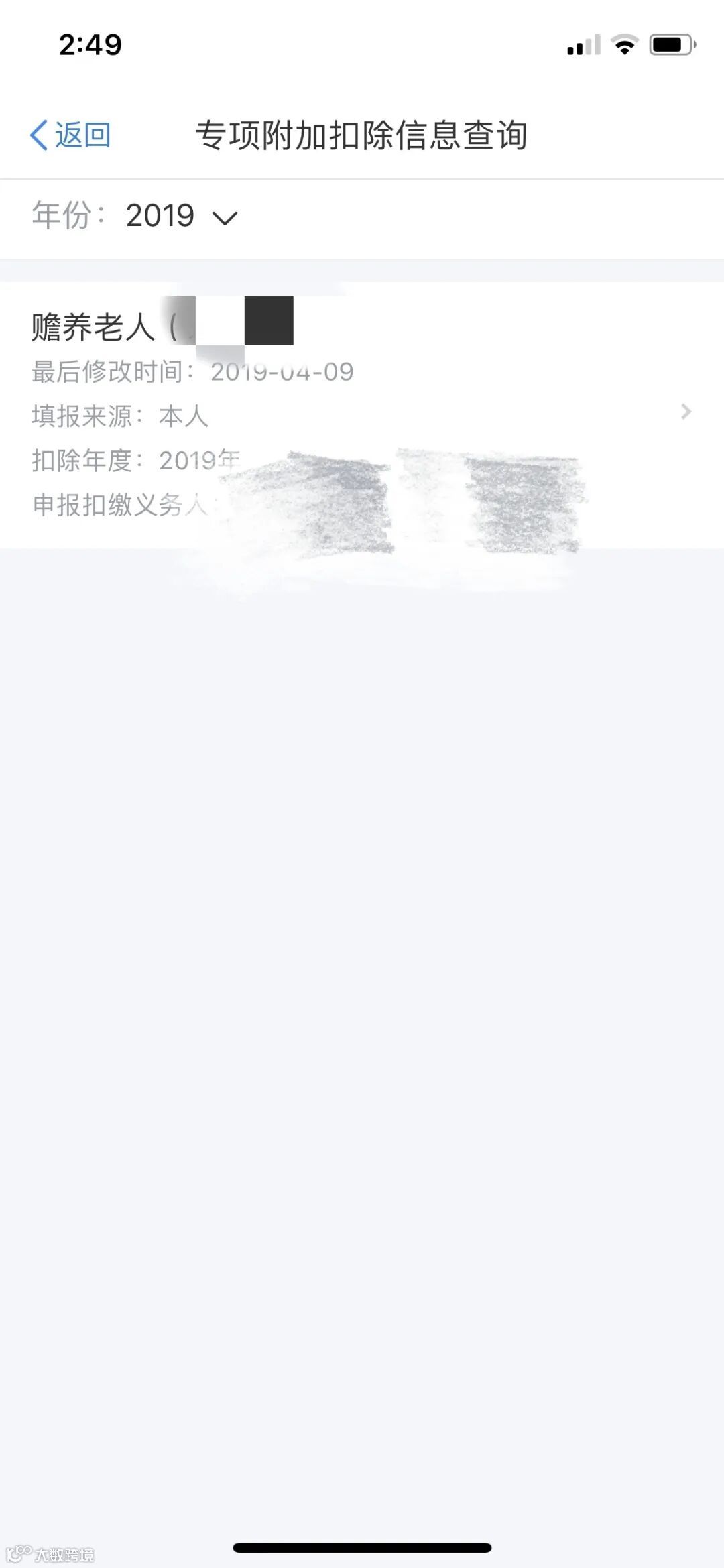 从首页-“常用业务”【专项附加扣除信息查询】或从服务-“申报信息查询”【专项附加扣除信息查询】进入,年份请选择“2019”,对已填报的专项附加扣除信息,逐项检查核对。