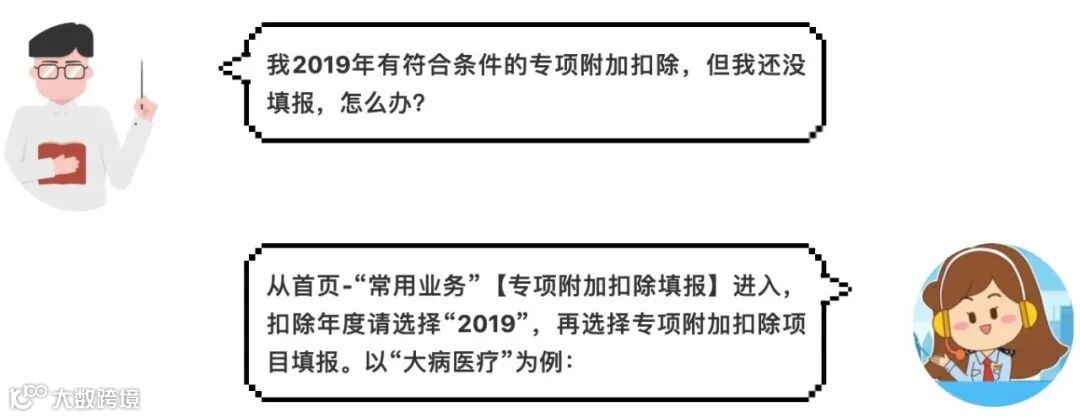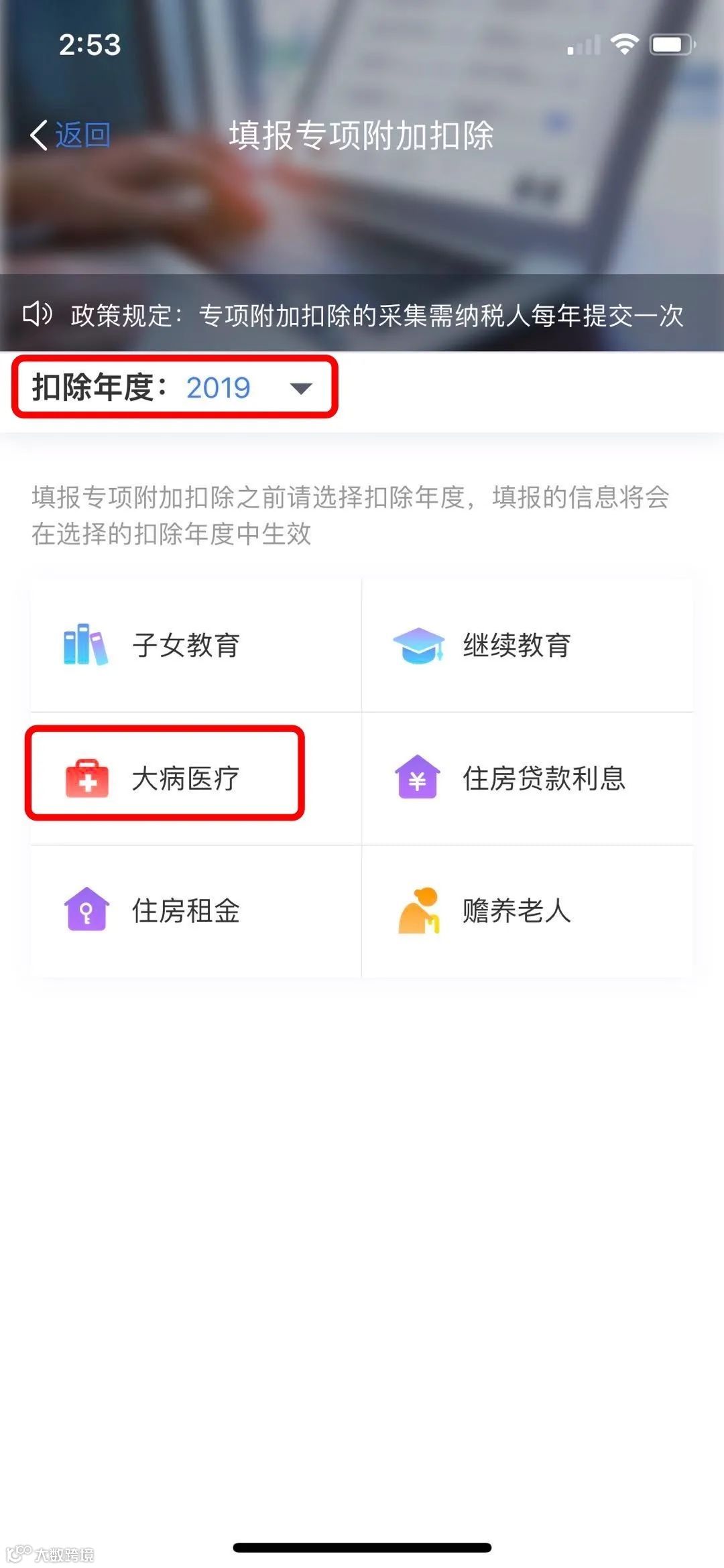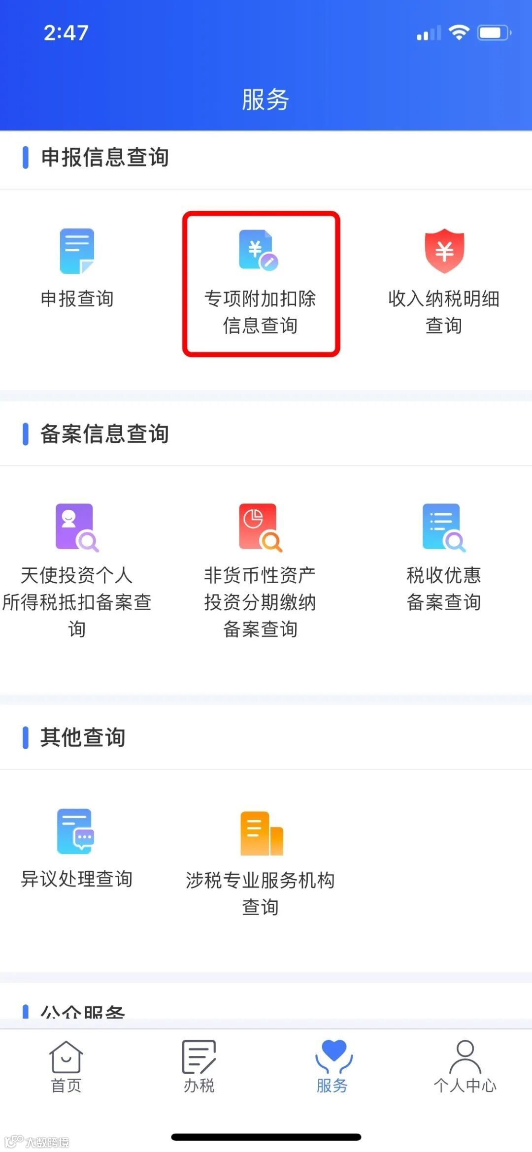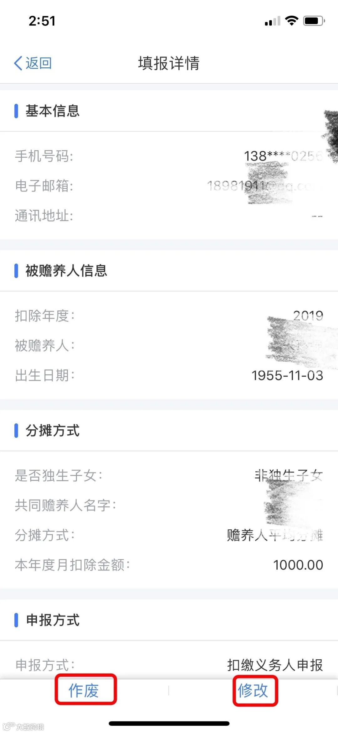 从首页-“常用业务”【专项附加扣除信息查询】或从服务-“申报信息查询”【专项附加扣除信息查询】进入,年份请选择“2019”,对已填报的专项附加扣除信息,逐项检查核对。