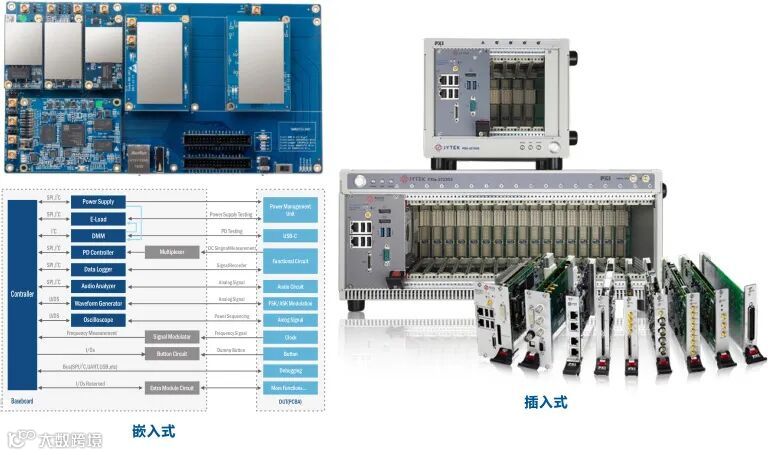 借助模块化嵌入式仪器,能够有效简化测试流程,优化生产效率。控制器模块基于 SoC 技术(FPGA + ARM),支持多种 I/O 通道和控制接口,并通过以太网与高速信号连接。平台搭配嵌入式仪器模块和 IP 库,可轻松实现数字万用表、示波器、信号发生器、数据记录仪、音频分析仪、电子负载等多种功能的组合与控制。