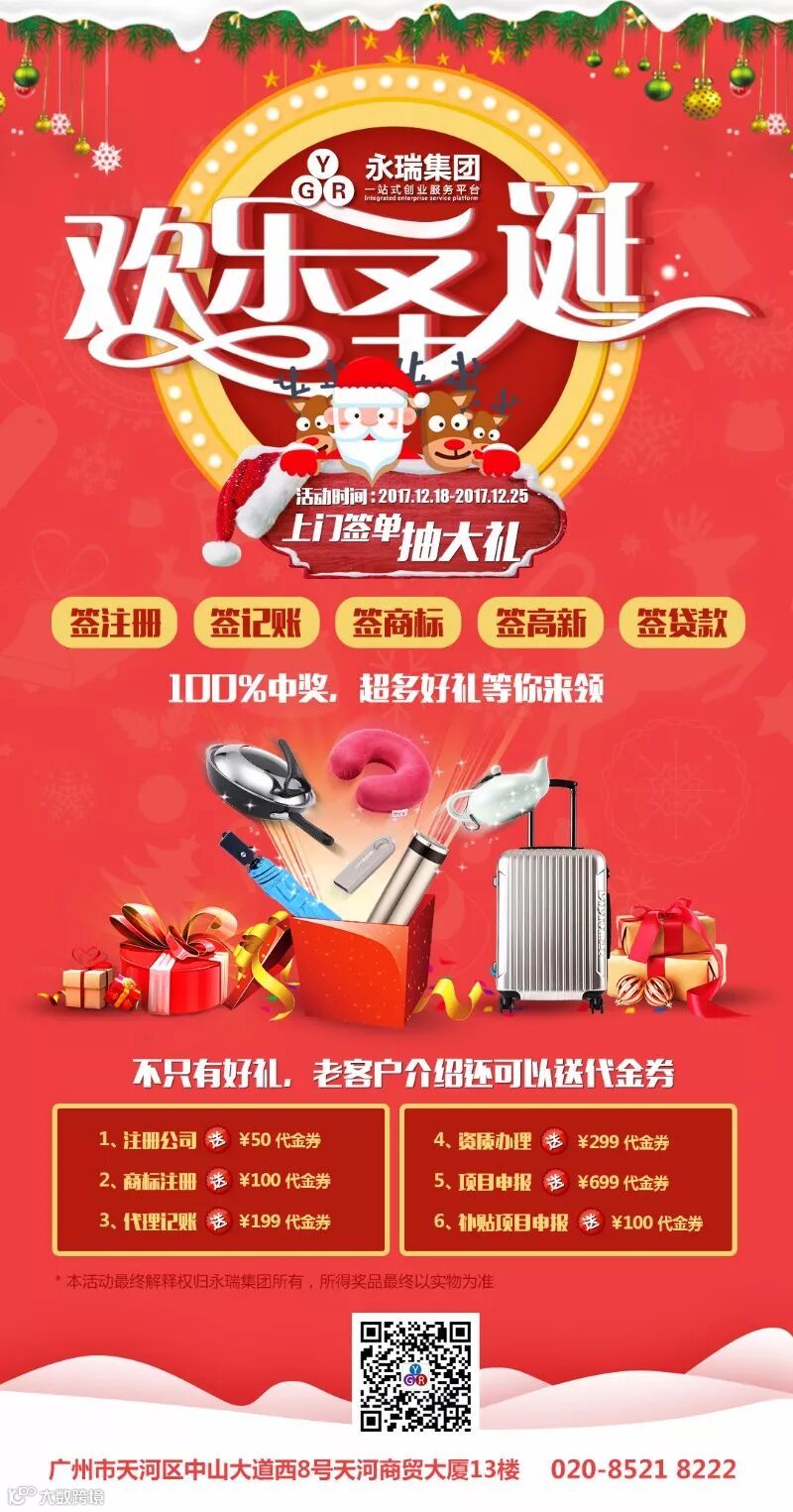 只要您来我们公司办理业务签单成功,即可参与圣诞活动,100%中奖!老客户推荐新客户签成,还送大面值业务代金券!
