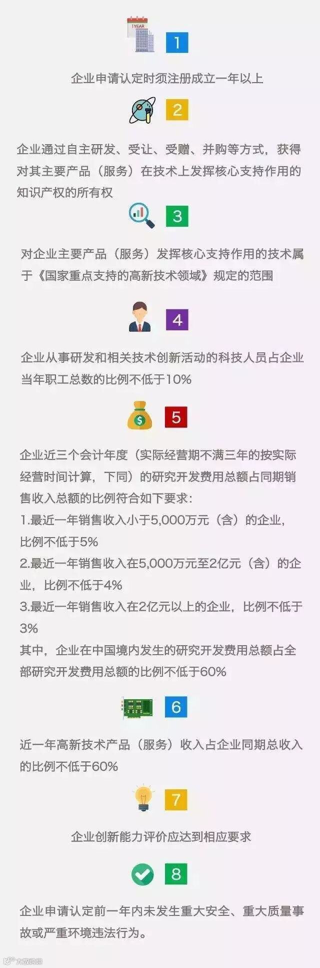 高新技术企业是指:在《国家重点支持的高新技术领域》内,持续进行研究开发与技术成果转化,形成企业核心自主知识产权,并以此为基础开展经营活动,在中国境内(不包括港、澳、台地区)注册的居民企业。认定为高新技术企业须同时满足以下八个条件: