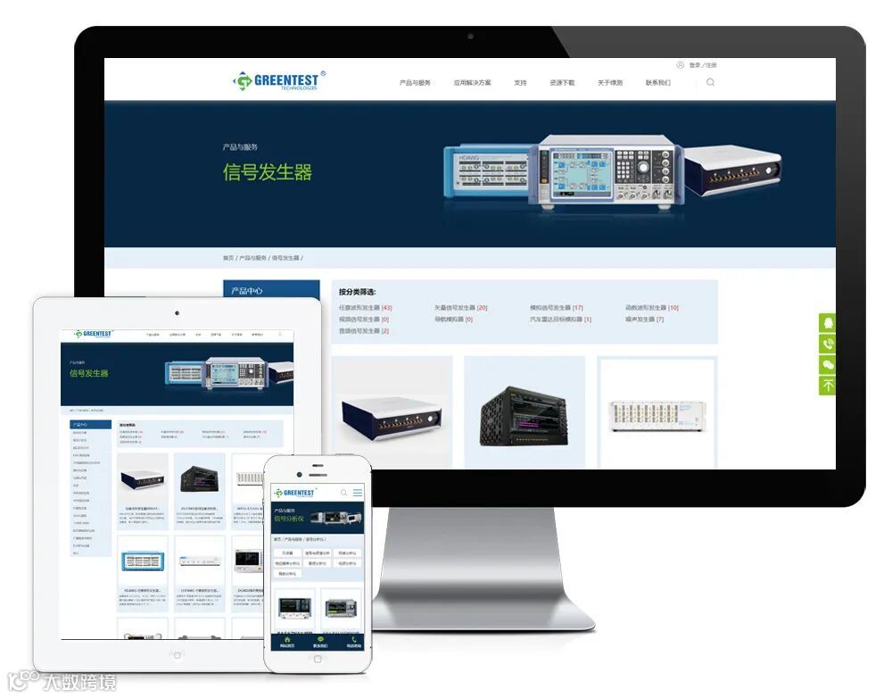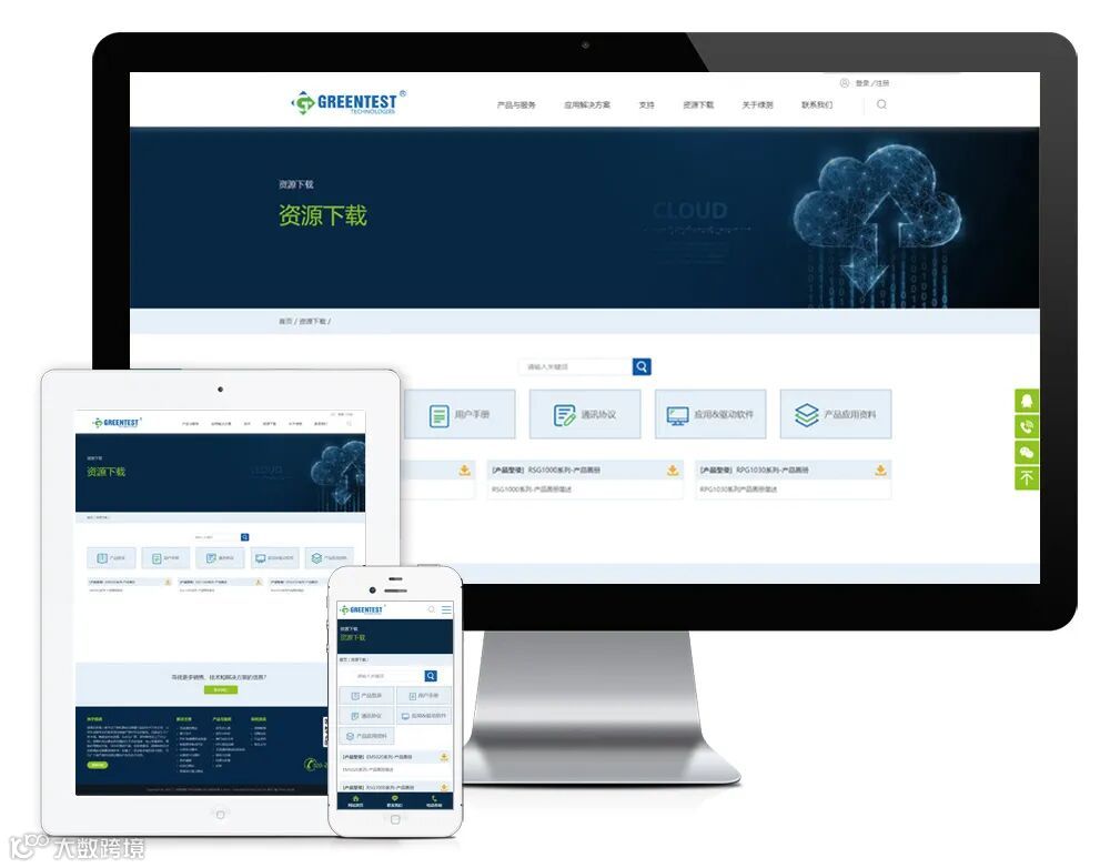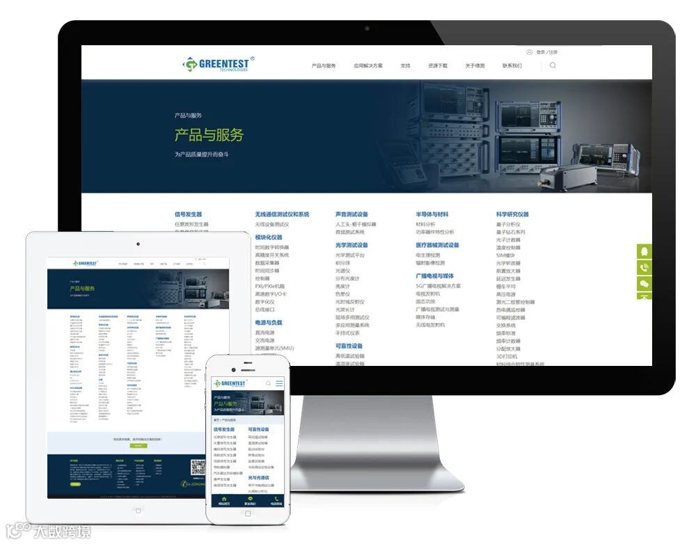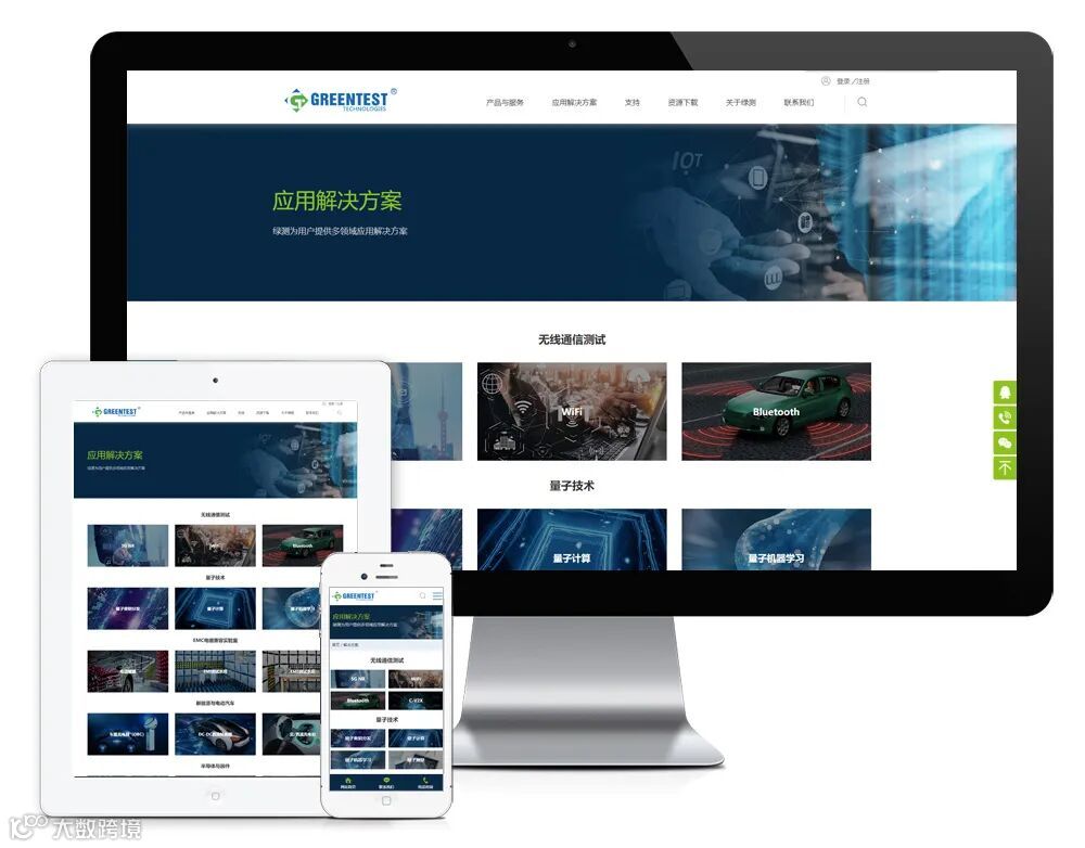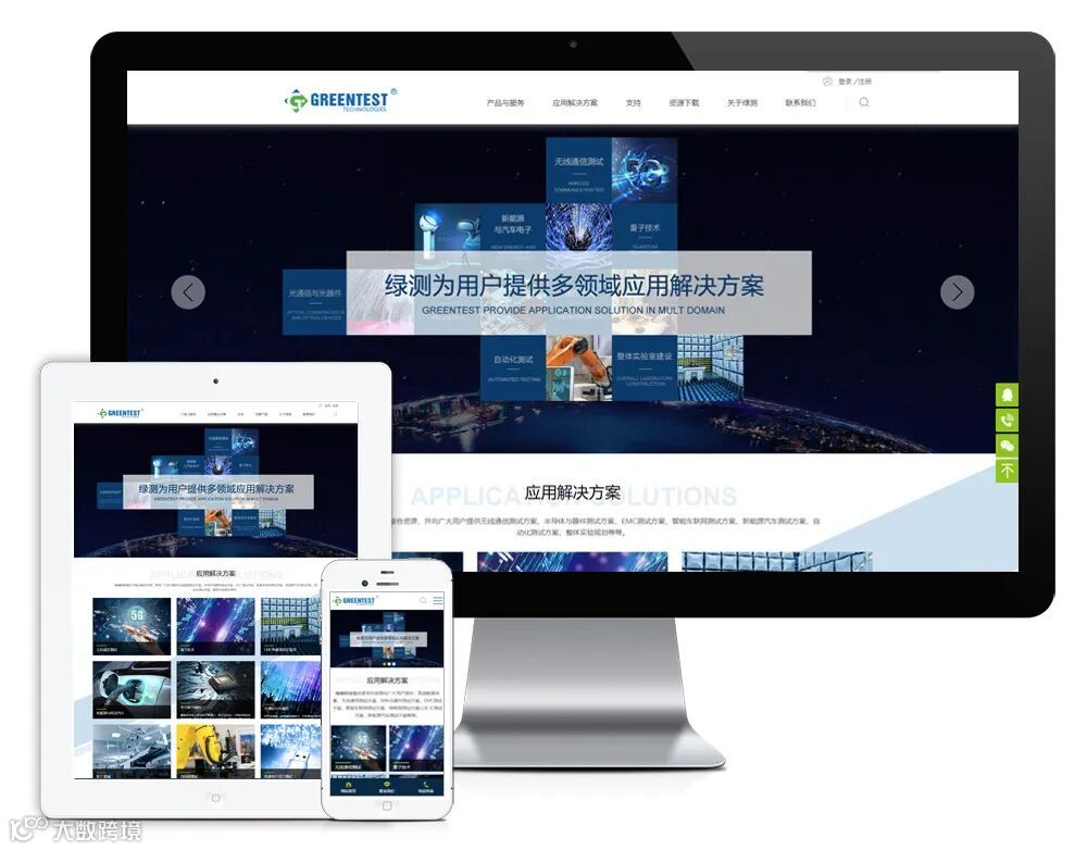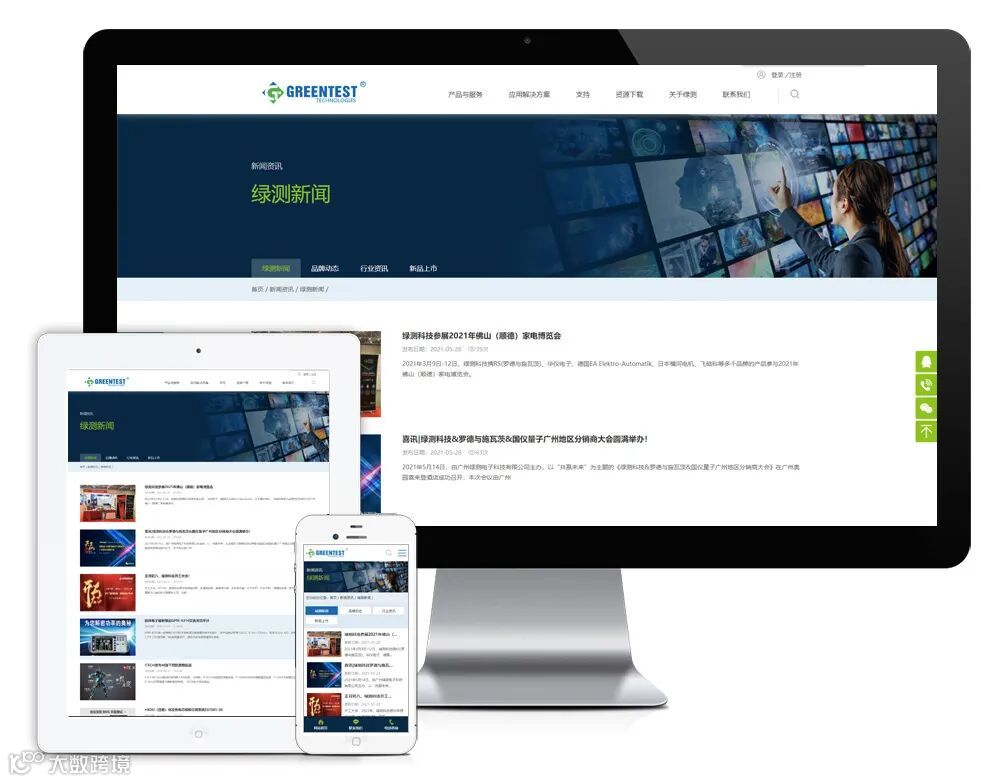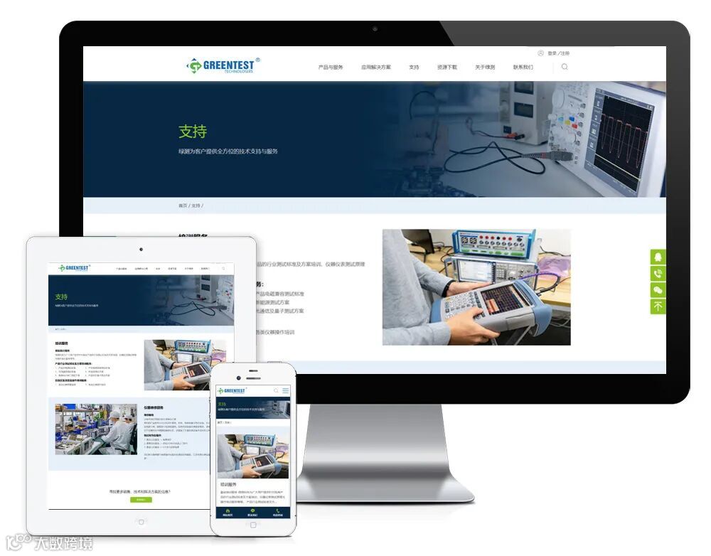 新版官网用html5+css3构建,同时适用于不同终端设备和系统平台。网站设置了以下栏目:产品与服务、应用解决方案、支持、资源下载、关于绿测、新闻资讯、联系我们。