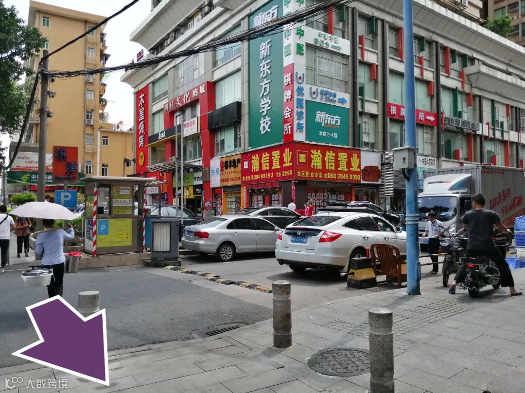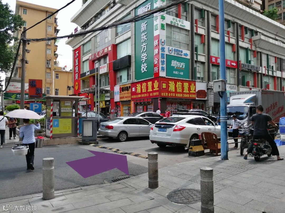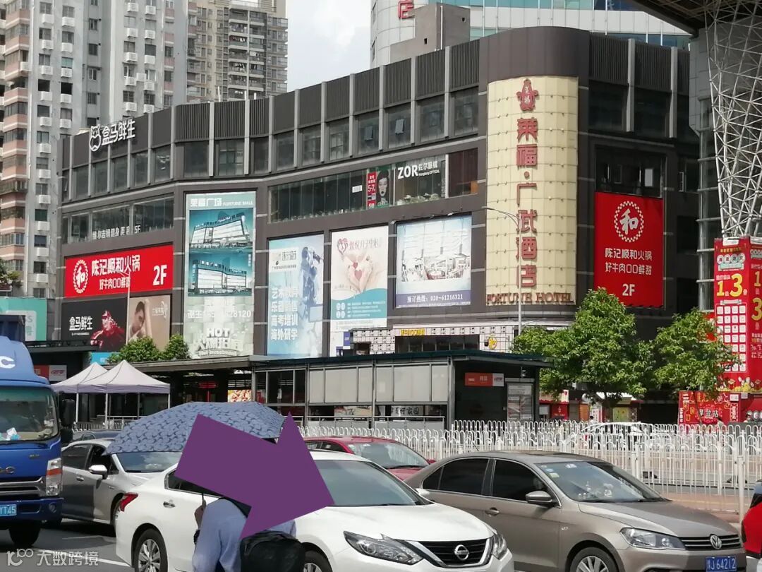 这次我们跟着 ②号箭头 走 天河商贸大厦大门 往前就是停车场入口了。
