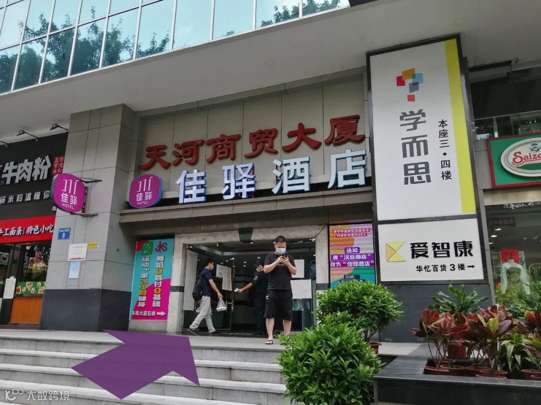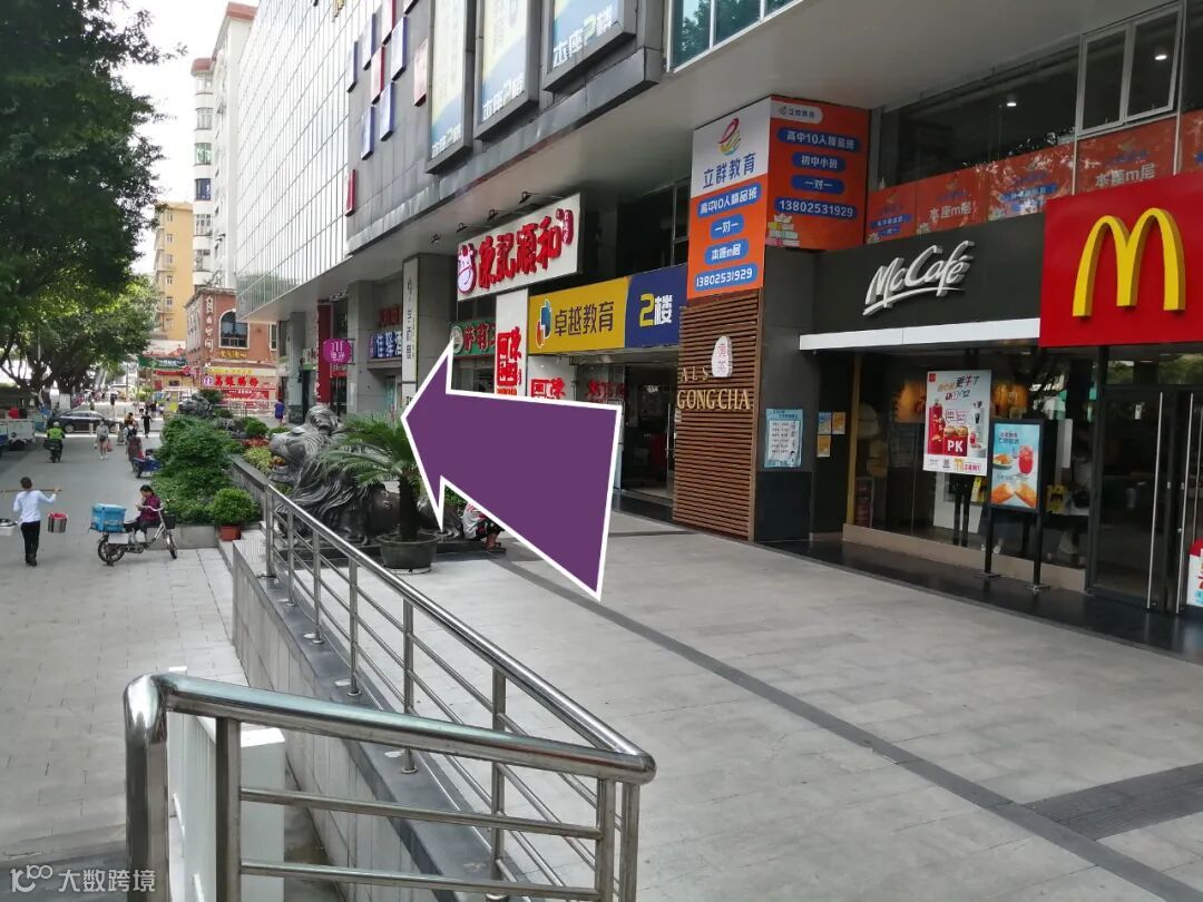 看到 麦当劳 顺着 紫色箭头 方向走几米即可看到 天河商贸大厦 。