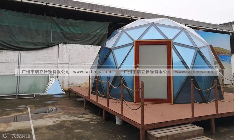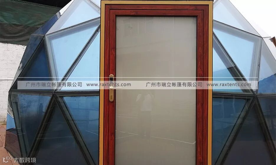 在这次的球形玻璃帐篷的设计中,把一半的玻璃换成了符合沙漠色调的铝塑板,铝塑板质量小,重量轻,适合出口,在中东的阳光照射下,它的内部层面即绚丽又凝重,同时还避免了光污染。
