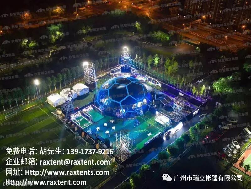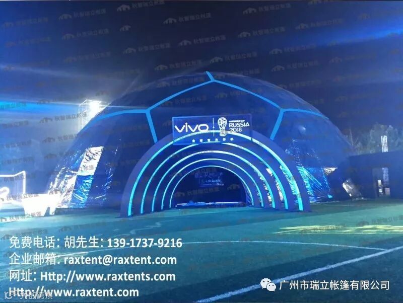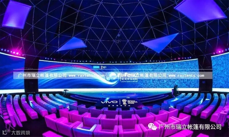 瑞立帐篷作为vivo世界杯定制手机发布会的篷房供应商,提供了一座直径30米的球篷及一系列配套尖顶欧式帐篷,协助客户圆满地举办了此次发布会。