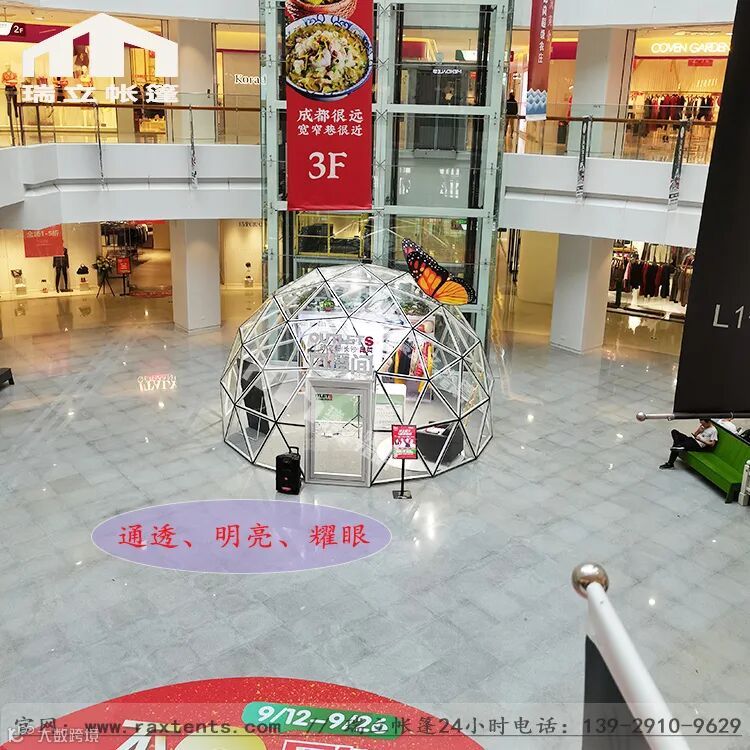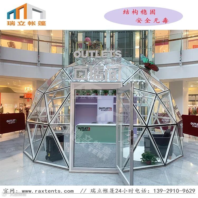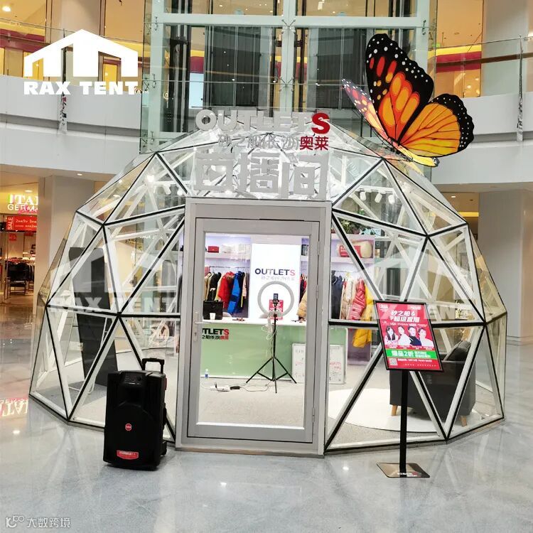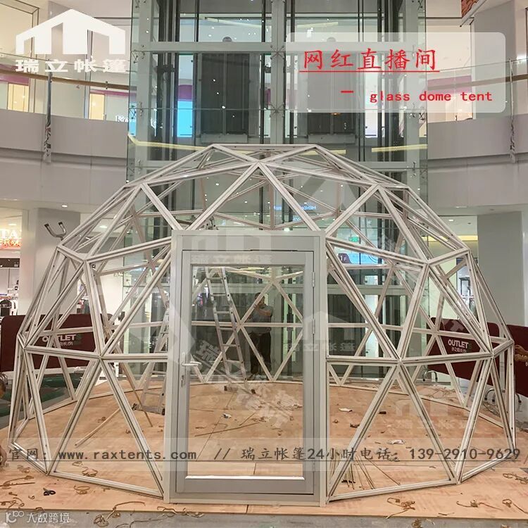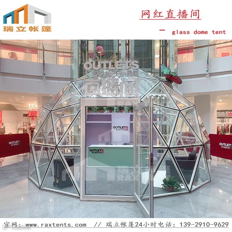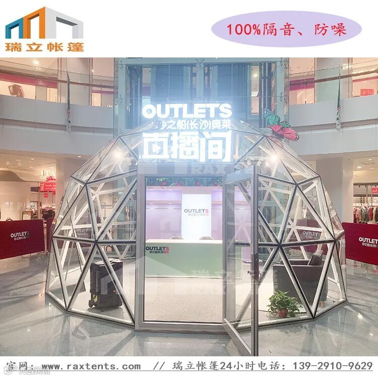 国内首个网红直播间玻璃帐篷亮相长沙奥特莱斯广场,集结了500+品牌,300万+商品,吸引近万人驻足观看,一睹风采。瑞立帐篷设计的这款玻璃罩用于奥特莱斯商场的直播间。