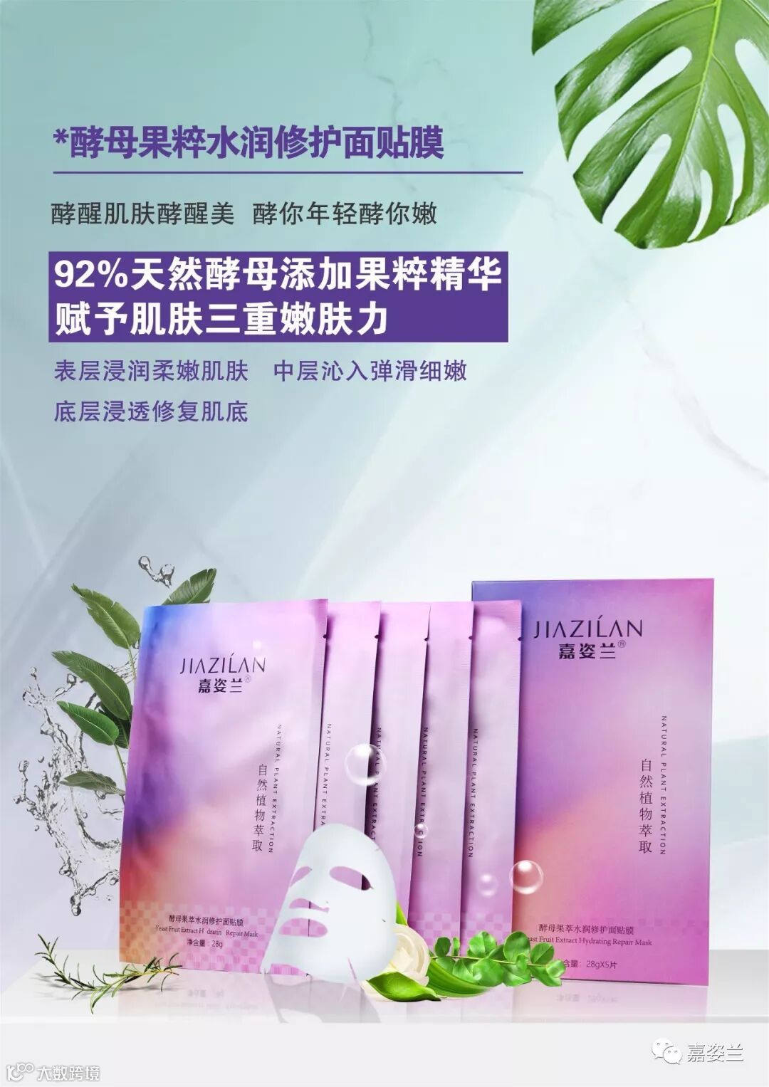 同时配合嘉姿兰酵母果萃水润修护面膜,92%的天然酵母添加果萃精华,赋予肌肤三重补水力,滋润保湿,舒缓皮肤,全天候保湿,一整天肌肤水当当!