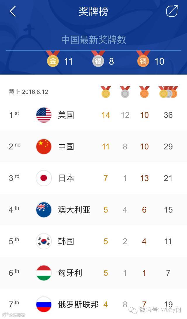 奥运金牌榜(截止8月12日10:00)