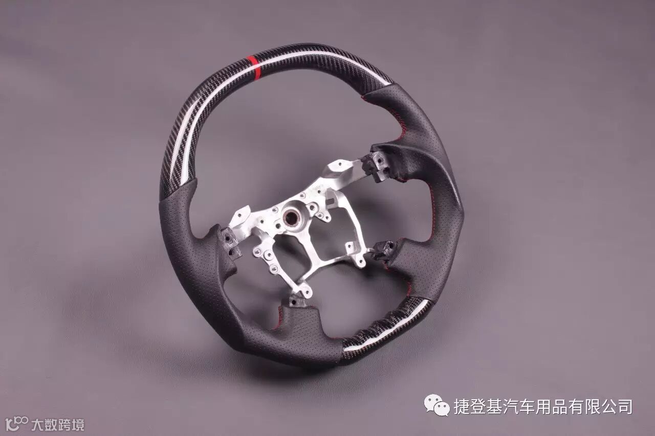 这个碳纤方向盘采用三段碳纤,加上孔皮、黑线,整体搭配文静、大气。但市面上很多碳纤方向盘,在颜色搭配方面有点劣势,首先颜色花俏,完全没有设计感。