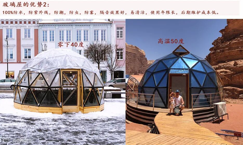 如果是在下雨天,窗外噼里啪啦的雨点声,玻璃球内却很安静,而且100%防雨防水,欣赏雨天景色也是非常不错的。如果是艳阳天,玻璃是可以阻挡部分紫外线的,还可以在内部安装空调,室内温度也能瞬间降下来,非常舒适。如果是夜晚繁星漫天或明月当空照的天气,那玻璃房欣赏星空真的是非常浪漫和震撼的。所以,不管风里雨里,白天夜晚,玻璃房都能全方面满足您的要求,美观又实用,就买它了。