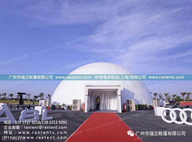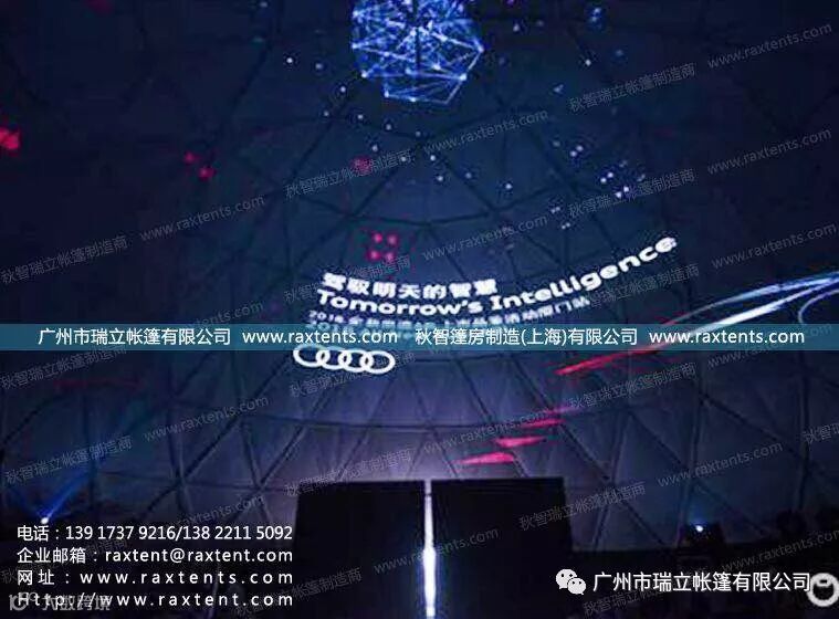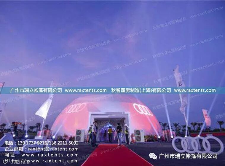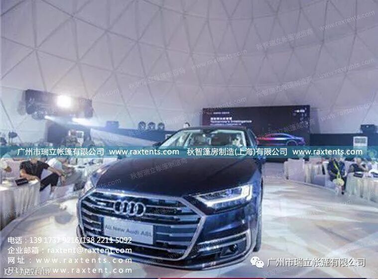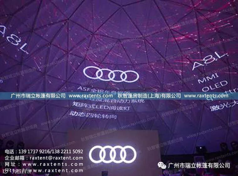 6月中旬,全新奥迪A8L上市品鉴活动厦门站在厦门厦金湾汽车文化中心拉开帷幕。广州市瑞立帐篷有限公司作为活动唯一指定帐篷供应商,为奥迪提供了一座直径20米的投影球幕帐篷,投影球幕形式创意新颖,投影效果震撼非凡,将奥迪A8L新车的舒适、高雅、豪华、尊贵气质展现的淋漓尽致,也给了到场嘉宾及VIP客户一次与众不同的新车体验之旅。