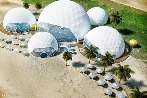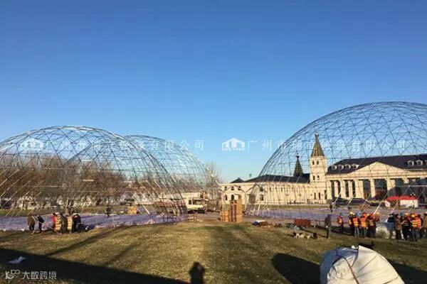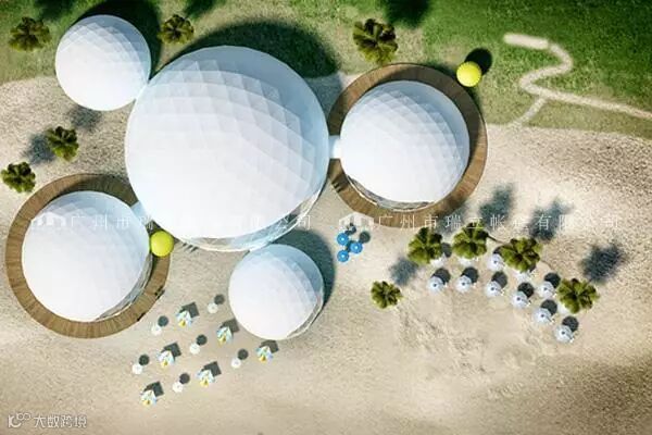 球形篷房由不锈钢管以及高强度铝合金管,篷顶为PVC篷布,可配套玻璃门,尺寸有半径为3m-50m。结构设计使得搭建更为快捷,很容易成为一个独立性的建筑。
