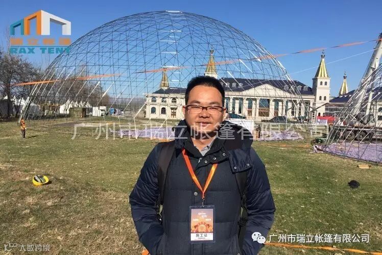 2016年11月11日,广州球形帐篷厂家瑞立公司接到这个项目的时候,离活动要求的开始搭建,也就是11月23日只有短短12天时间,除去运输时间,只有不到10天的生产周期。瑞立公司全体同仁顶着压力,无论从设计、生产至发货都严格把控,日夜轮班制作,在规定的时间内到达搭建现场,并用3天时间,将两座50米和一座35米的球形框架搭建完成,让内饰能顺利开始下一步工作,在接下来几天时间里,成功安装好整体透明篷布并交付使用。