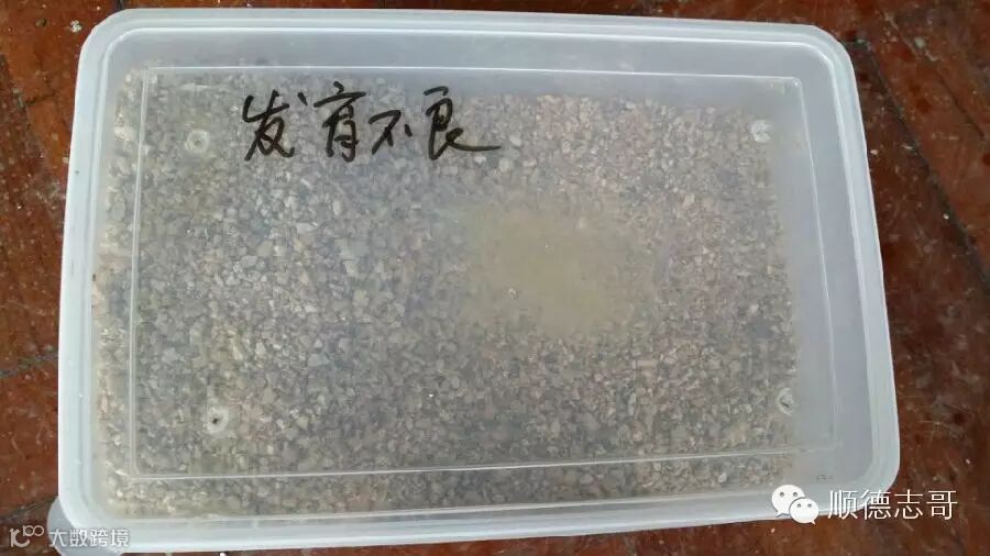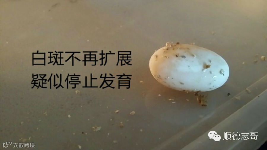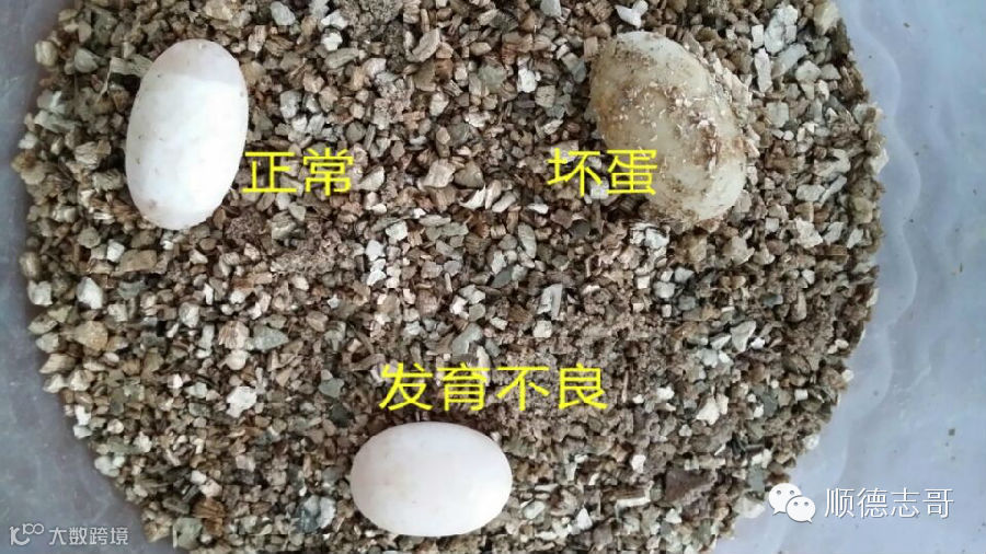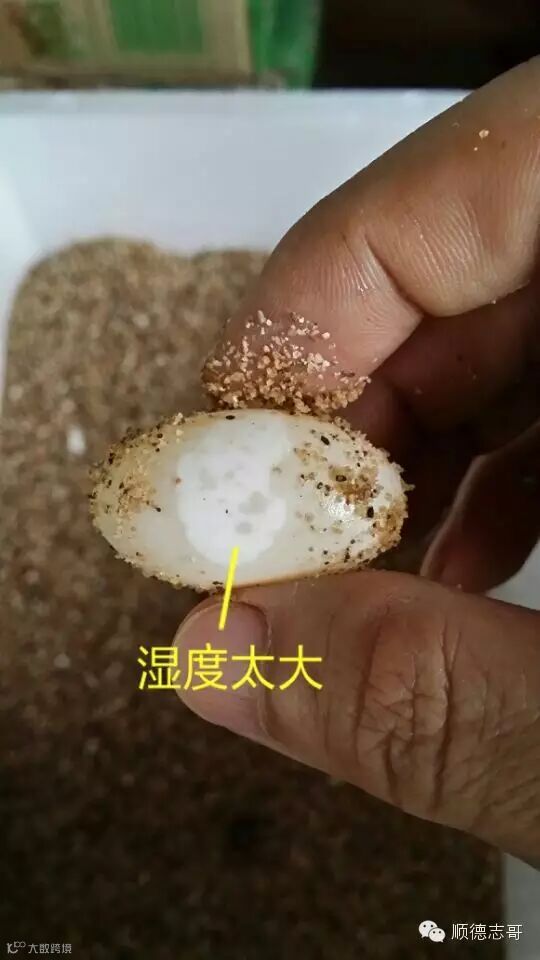 湿度过大的话,受精卵白环的表面,接触沙土、蛭石的地方有“水印”,湿度越大越明显。