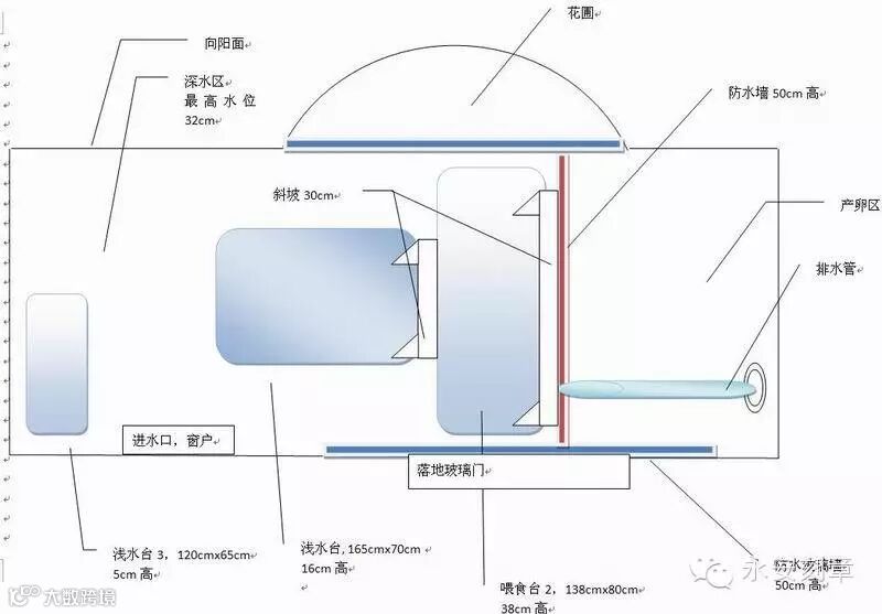这是一张在阳台建造龟池的设计图,适合面积为 10 平米左右的阳台,仅供参考。
