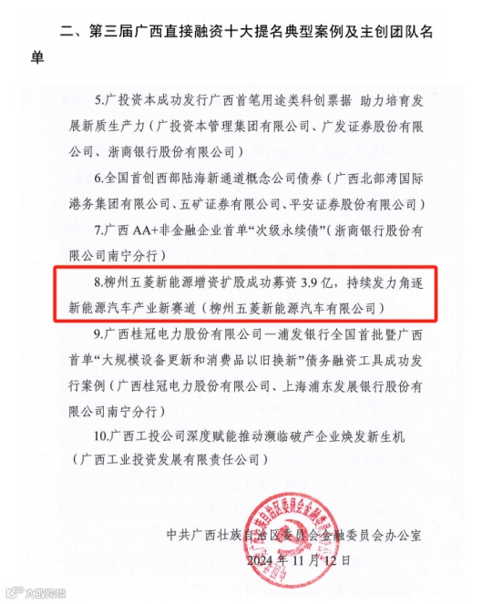 自治区金融办公布第三届广西直接融资典型案例及主创团队评选结果,柳州五菱新能源《柳州五菱新能源增资扩股成功募资3.9亿,持续发力角逐新能源汽车产业新赛道》成功入选“第三届广西直接融资十大提名典型案例”。