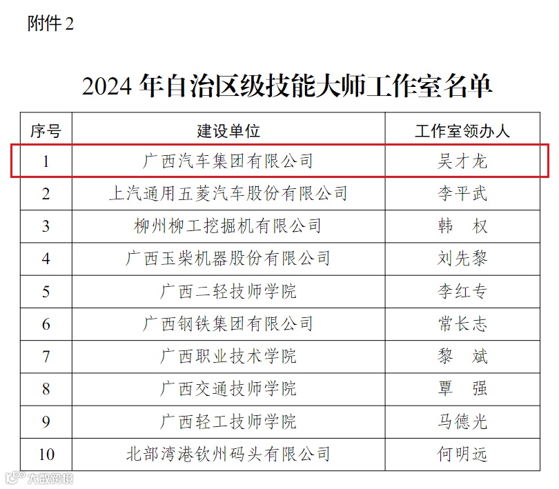 广西壮族自治区人力资源和社会保障厅公布2024年自治区级高技能人才建设项目名单,集团所属五菱柳机吴才龙技能大师工作室获评2024年自治区级技能大师工作室。截至目前,广西汽车集团已拥有3个国家级技能大师工作室、3个自治区级技能大师工作室。