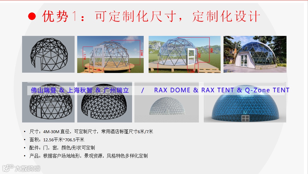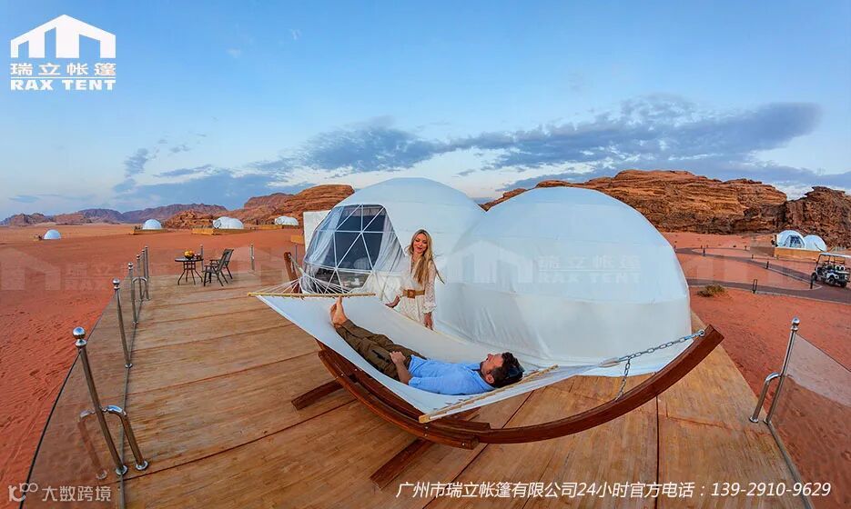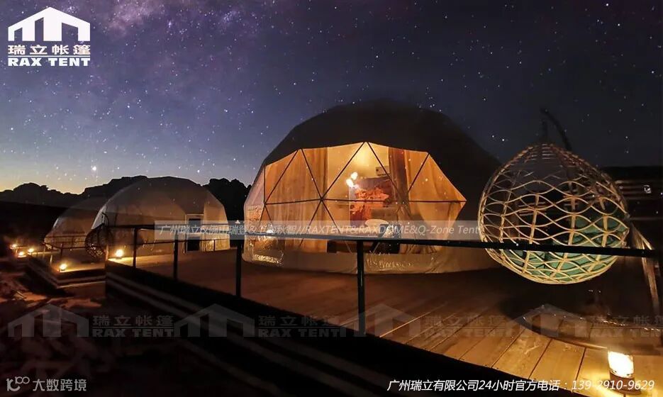 1) 定制化产品,定制化尺寸,定制化设计。玻璃球形帐篷酒店和PVC球形帐篷酒店,常用酒店帐篷尺寸6米/7米,面积:12.56平米~706.5平米,可定制尺寸。常用配件为门,窗,颜色/形状可定制。产品类型可根据客户场地地形,景观资源,风格特色多样化定制。瑞立帐篷有多种产品做帐篷酒店选择:玻璃球形帐篷酒店,PVC布款球形帐篷酒店,贝壳形帐篷酒店,透明星空房,PVDF膜结构帐篷酒店等。