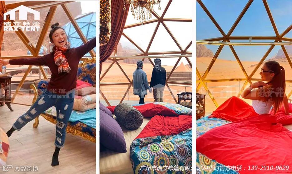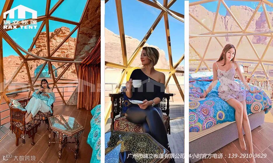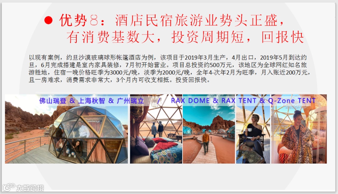 再以与我司合作的帐篷酒店案例为例,约旦的Aicha memories luxurycampsite为例,我司为该营地提供了一批玻璃球形帐篷酒店,该项目于2019年3月生产,4月出口,2019年5月到达约旦,6月完成搭建室内家具装修,7月初开始营业。项目总投资约500万元,由于该地区已经有当地政府对于文旅产业投资的引导,独特的沙漠自然景观已成为全球网红知名旅游胜地,营地营业之初住宿一晚价格旺季为3000元/晚,淡季为2000元/晚,全年4-次年2月为旺季,月入账近200万元,且一房难求,供不应求,消费需求非常大,3个月内可收支相抵。投资回报的速度快过于其他投资。按照国内酒店的市场价格,旺季价格300元-400元/晚,淡季200元-300元/晚,月入账会低于国外的帐篷酒店,但投入也少于国外酒店帐篷市场,投资回报周期也快于传统酒店市场。