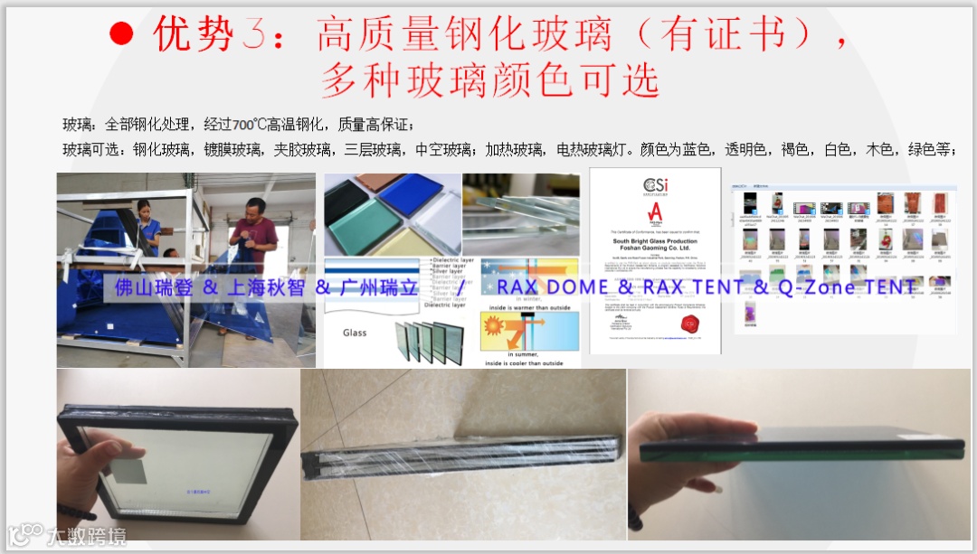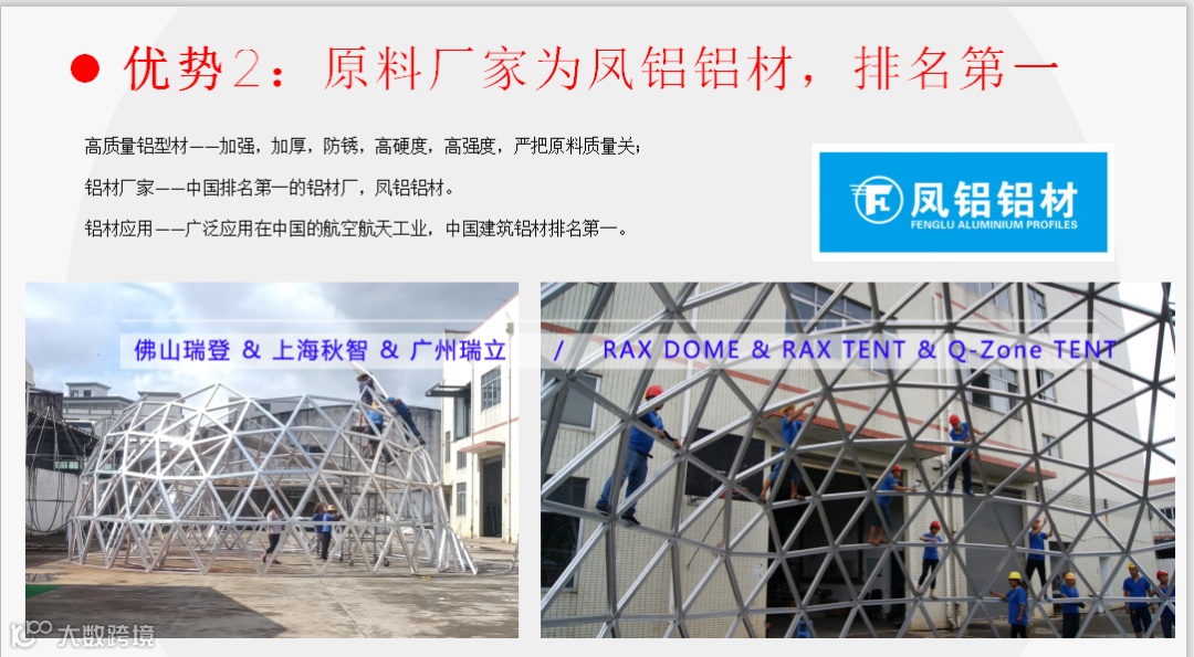 2) 玻璃球形帐篷原料厂家为凤铝铝材,行业内排名第一,材料取自于航天航空及建筑建材,原料质量过关,成品质量过硬。PVC球形帐篷生产材料为三层覆盖,舒适安全,经济环保,防水防火,材料为独家供应。