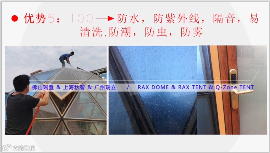5) 酒店帐篷产品100%防水,防紫外线,隔音,易清洗,并且防潮,防虫,防雾,保证了户外露营居住时的安全与舒适,静谧与私隐。