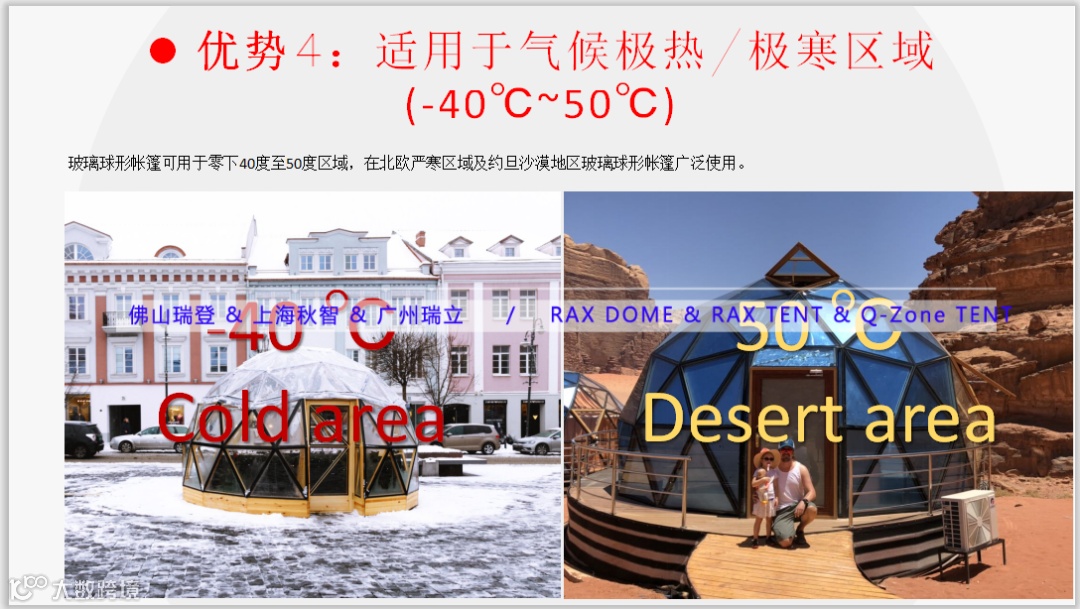 4) 所有产品均适用于气候极热/极寒区域。(-40℃~50℃)不管是在炎热的南方湿热天气还是在北方的严寒雨雪天气,均可使用,抗风10-12级,抗雪载75kg/平米,我司帐篷酒店产品具备严格的产品检测报告,更安全,让投资者完全无后顾之忧。