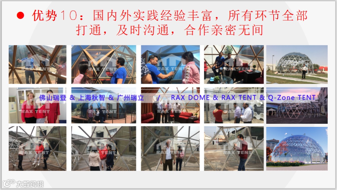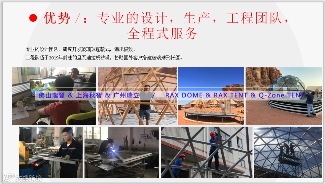 7) 瑞立帐篷从2018年年初开始已有专业的团队服务于酒店帐篷项目,专业的设计,生产,工程团队,全程式服务,让投资者更放心,省心。