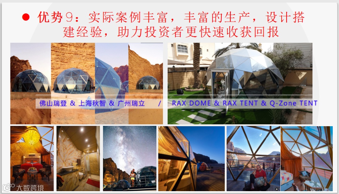 目前,我国正是大力发展文旅产业之时,全国各地正在极力推崇地方特色旅游,像内蒙古,新疆,青海,河北,北京,大连,浙江,福建,江西,湖南,广东,广西,海南等已有多个帐篷酒店已开始运营,市场投资价值即将迎来井喷期,目前对于投资者是一个很好的进入时机!
