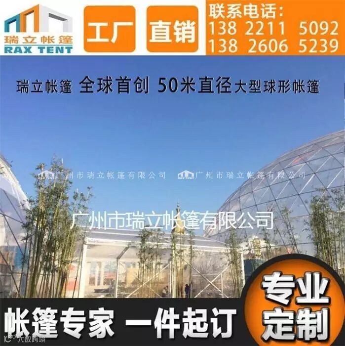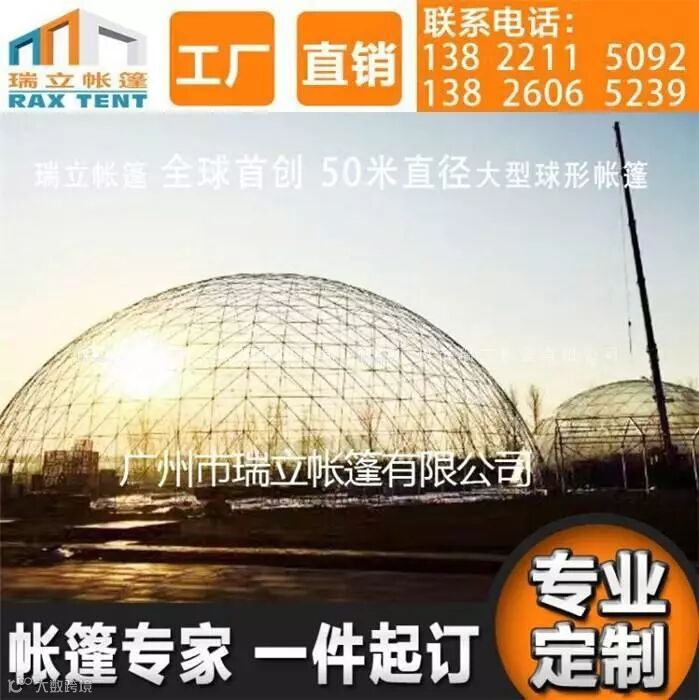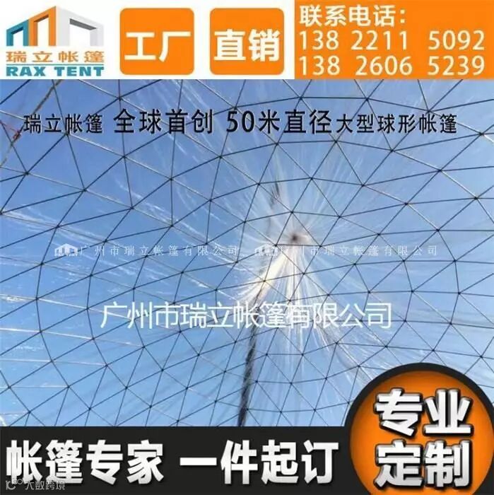 广州瑞立帐篷有限公司设计制作的50米直径的球形帐篷,是目前全球最1大的球形帐篷尺寸,瑞立帐篷已经成功取得并且获得各项证书,欢迎各界朋友莅临本公司洽谈合作!