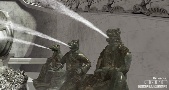 海晏堂由正楼和后工字蓄水楼组成,是最大的一处欧式园林景观。海晏堂正楼朝西,上下各十一间,楼门左右有叠落式喷水槽,阶下为一大型喷水池,池左右呈"八"字形排列着我国十二生肖人身兽头铜像。每昼夜十二个时辰,由十二生肖依次轮流喷水,俗称"水力钟"。