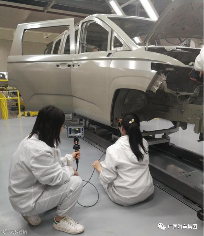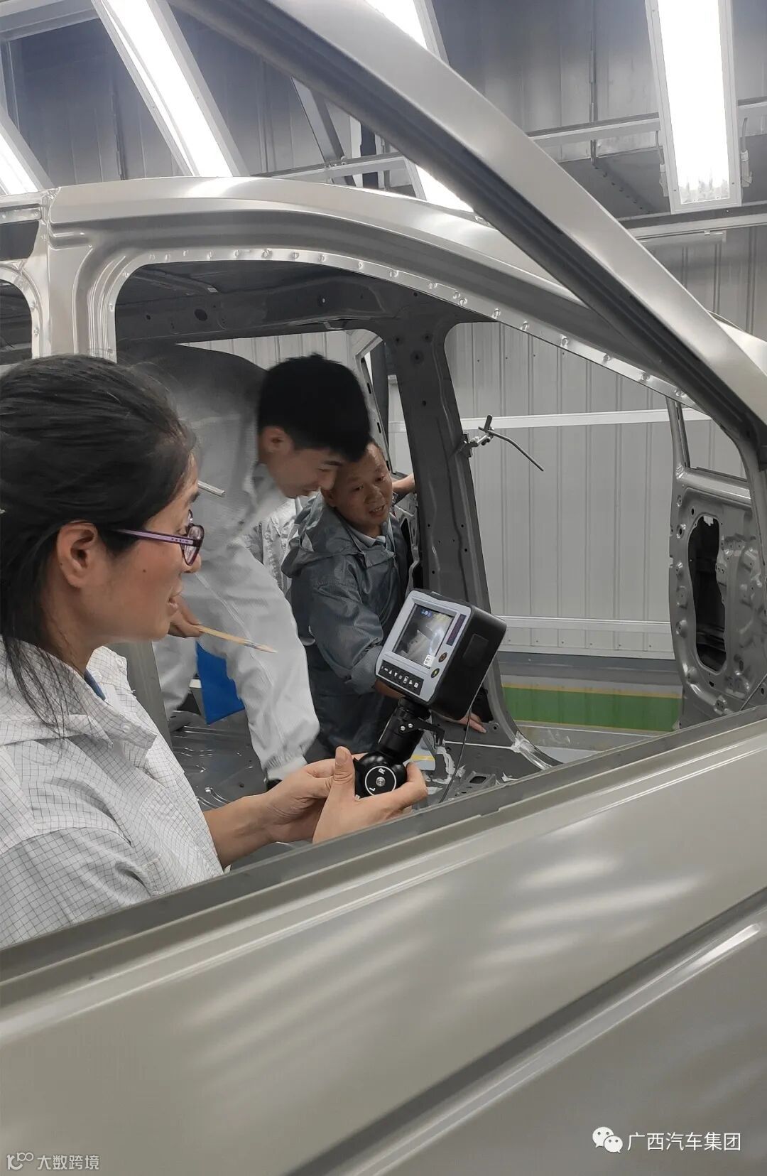 在新能源汽车基地涂装车间PVC-Audit区,涂装工艺工程师们利用新购买的内窥镜设备,正在检查公司车辆内腔的电泳状态。利用此设备,把探头伸入需要观察的车身内腔,内腔的状态通过高清显示屏展现出来,不需要通过人工拆解就可以轻松快捷的观察到白车身各内腔的电泳漆上膜情况,了解白车身各部位是否存在因积气等现象引起的成膜不良问题。
