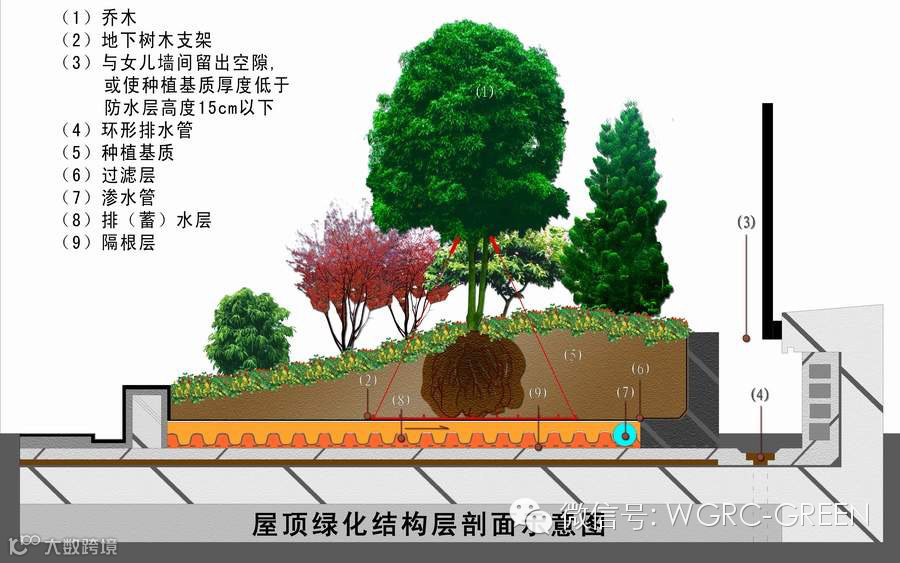 排(蓄)水层:排(蓄)水层是将过滤过的水,从空隙中汇集到泄水孔排出。在耐根穿刺层上 应铺设具有一定空隙、承载能力以及蓄水功能的塑料排水板、橡胶排水板或粒径为20~50 mm的卵石组成蓄排水层,便于及时排除多余的积水。 隔离过滤层:是设置在种植介质层与排水层之间起滤水作用的一个构造层。为防止种植土的流失,应在排(蓄)水层上铺设200~250 g/m2聚酯无纺布等做过滤层。 种植介质:种植介质是屋面植物赖以生长的土壤层,应具有自重轻、不板结、保水保肥、适宜植物生长、施工简便和经济环保等性能。其厚度可根据种植植物的品种而定。一般地被植物的种植介质 厚度应为100~200 mm;小灌木为300~400 mm;大灌木为500~600 mm;乔木为800 mm以上。