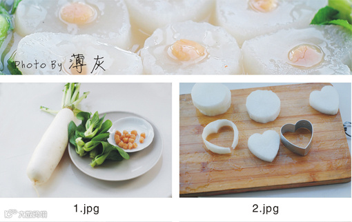 灰 灰小贴士:◎蒸萝卜的原汁千万别倒了,很鲜的。◎萝卜中间的小孔可以比干贝稍微大一点,因为干贝蒸好了会膨胀。◎煮上海青时,水里滴几滴油和撒少许盐,可 以让菜色碧绿更好看。 白萝卜含芥子油、淀粉酶和粗纤维,具有促进消化,增强食欲,加快胃肠蠕动和止咳化痰的作用。还能增强机体免疫功能,防癌抗癌。主要用于腹胀停食、腹痛、咳 嗽、痰多等症。干贝即扇贝的干制品,其味道、色泽、形态与海参、鲍鱼不相上下。古人曰:“食后三日,犹觉鸡虾乏味。”可见干贝之鲜美非同一般。它是由扇贝 的裙边风干制成.