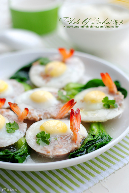材料:虾6条、猪肉末150g、上海青6棵、鹌鹑蛋6个、火腿末1大匙,香菜末少许、小碗(我用的蛋挞模,或根据现有工具选择)调料:姜末、葱末、胡椒粉1小勺、料酒1小匙、盐1小匙、水淀粉、高汤、香油1匙、生抽1匙、蚝油1匙