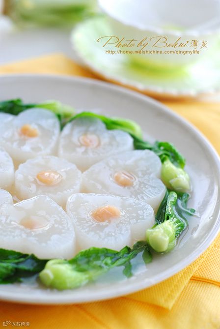 材料:白萝卜1个、干贝8粒、上海青8棵调料:水淀粉、盐1小匙、高汤适量