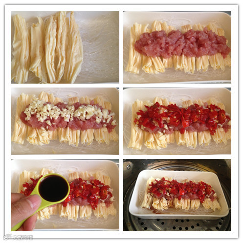 主料:腐竹、粉丝、肉末各适量配料:蒜、料酒、盐、白胡椒粉、剁椒、生抽各适量做法: