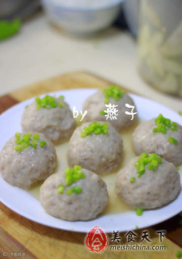 制 作步骤1. 材料图。(五花肉、莲藕、葱、姜)2. 把肥肉取下,切成小丁,莲藕去皮切成小丁。3. 把瘦肉切成小丁。4. 剁成较细的肉糜。(满意程度的7分左右即可)5. 加入切好的莲藕丁,剁至与肉基本融合。6. 加入切好的肥肉丁。7. 剁至三者完全融合。8. 剁好的肉糜放入较深的盆中,加入食盐、生抽、料酒、白糖、姜末、葱白末,顺同一方向搅拌均匀。9. 缓缓加入水淀粉,边加边顺同一方向搅拌,加完以后继续搅拌5分钟左右。10. 依次做成兵乓球大小的肉丸。11. 做好以后放入抹了一层薄油的盘里,中间稍微隔开。12. 入开水锅蒸10分钟左右。(出锅原汤不要倒掉,撒上葱花即可食用)