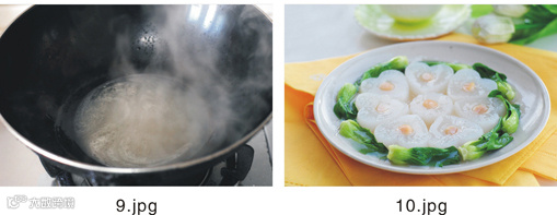 10、开水中加少许盐、油,将上海青烫熟摆盘,最后浇上薄芡汤汁即可。