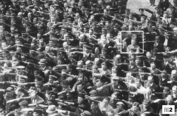图2、永不妥协——平凡的男人,非凡的勇气。1936年汉堡,船厂工人们在观看纳粹海军训练舰下水仪式。在向纳粹致敬的人海中,只有这名男子拒绝举手。此前,因为和一位犹太女人结婚,他已被判两年苦力。二战中失踪。1949年被宣布死亡。1991年这张照片刊登时,一名女子认出这是她的父亲,这个男人的名字叫August Landmesser。
