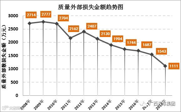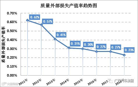 通过QC活动、CPIP系统改进、SPC控制方法、质量系统建立等一系列质量管理手段,从2008年外部质量损失2714万元,降低到2018年的1111万元,同比下降59%,累计减少质量损失为7024万元。质量外部损失产值率从2011年的0.62%降低到0.23%。