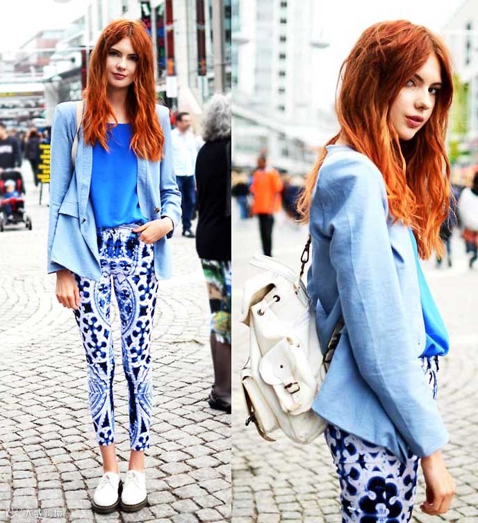 2、条纹或者花纹的上衣需配素色的裤子。