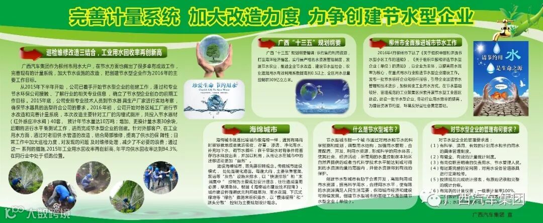 申报节水型企业需要大量的节水制度、文件、用水规划、节水宣传等作为支撑,通过以上工作,大大提高了各区域工厂节水的理念和意识。