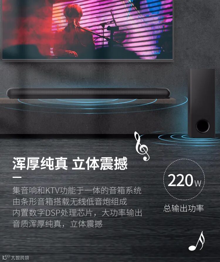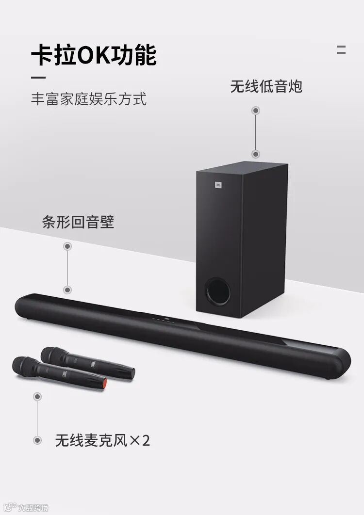 导读:JBL KTV350卡拉OK家庭影院条形音箱是一款集音响和KTV功能于一体的音箱系统,由条形音箱搭载无线低音炮组成,内置数字DSP处理芯片,大功率输出,音质浑厚纯真,立体震感。音箱系统还支持K歌功能,