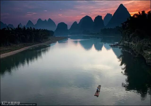 中国的山水总有一种水墨画般的魅力,此图应是渔舟唱晚。