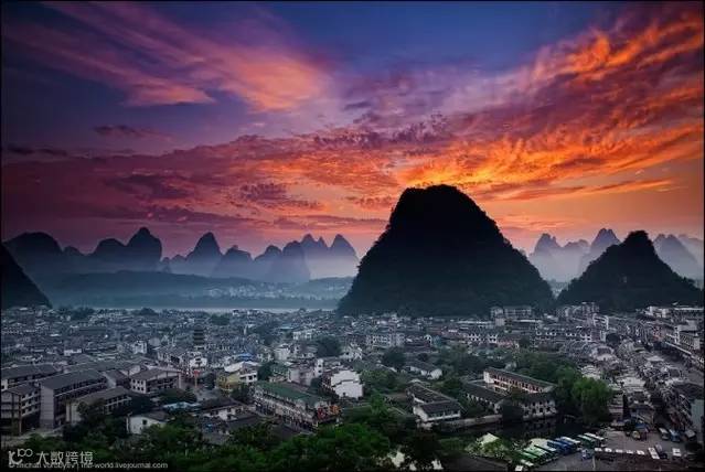 火烧云略过山脊,就像是火山喷薄而出,远方的雾霭已经弥漫,近处的城市也已向晚。