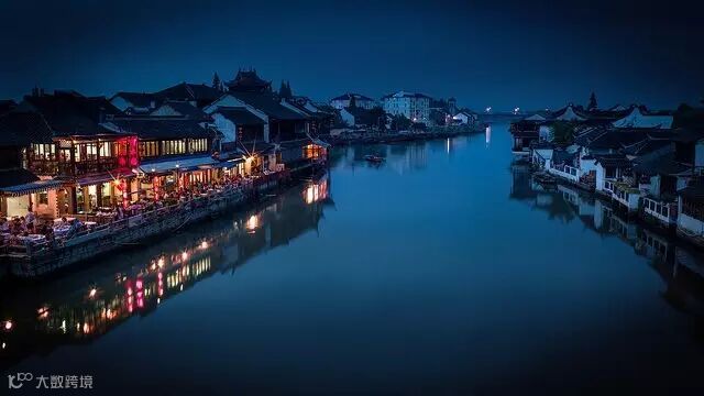 同样是夜晚,一边是灯光璀璨,倒影流光,一边是寂寂人家,暗夜无声。