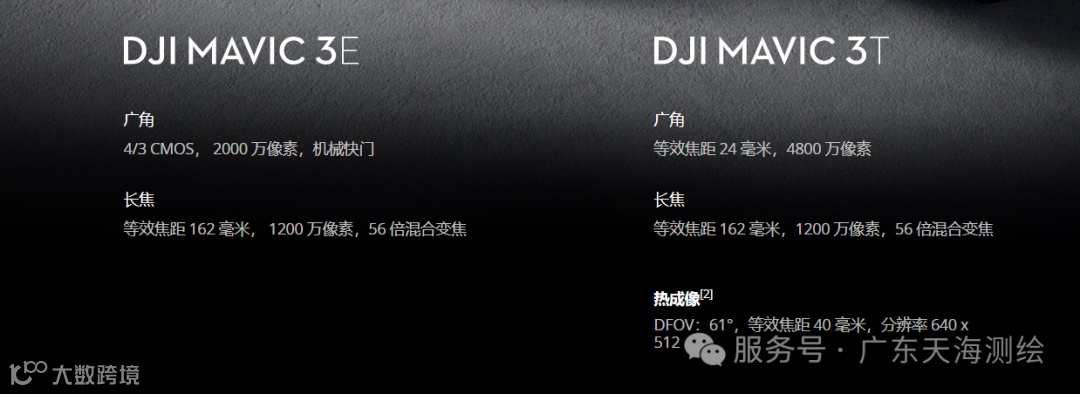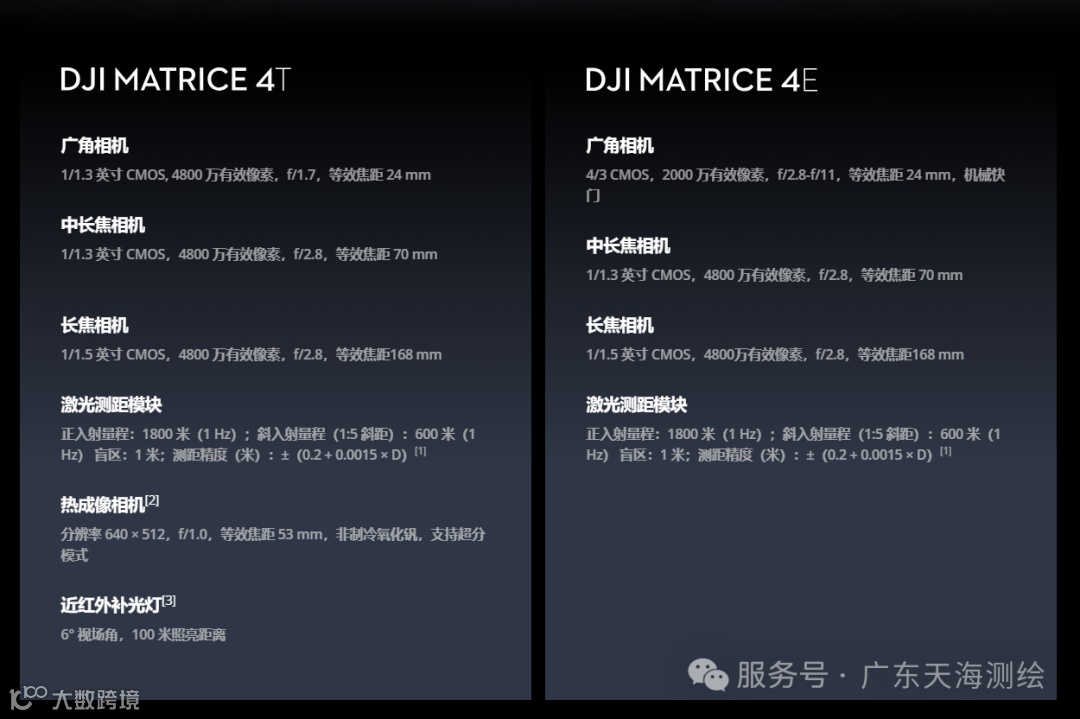 ①M4E比M3E多了一个中长焦镜头和一个激光测距模块,M4T比M3T多了中长焦镜头,激光测距模块和一个近红外补光灯,且镜头的焦距等都有不同程度的增加。